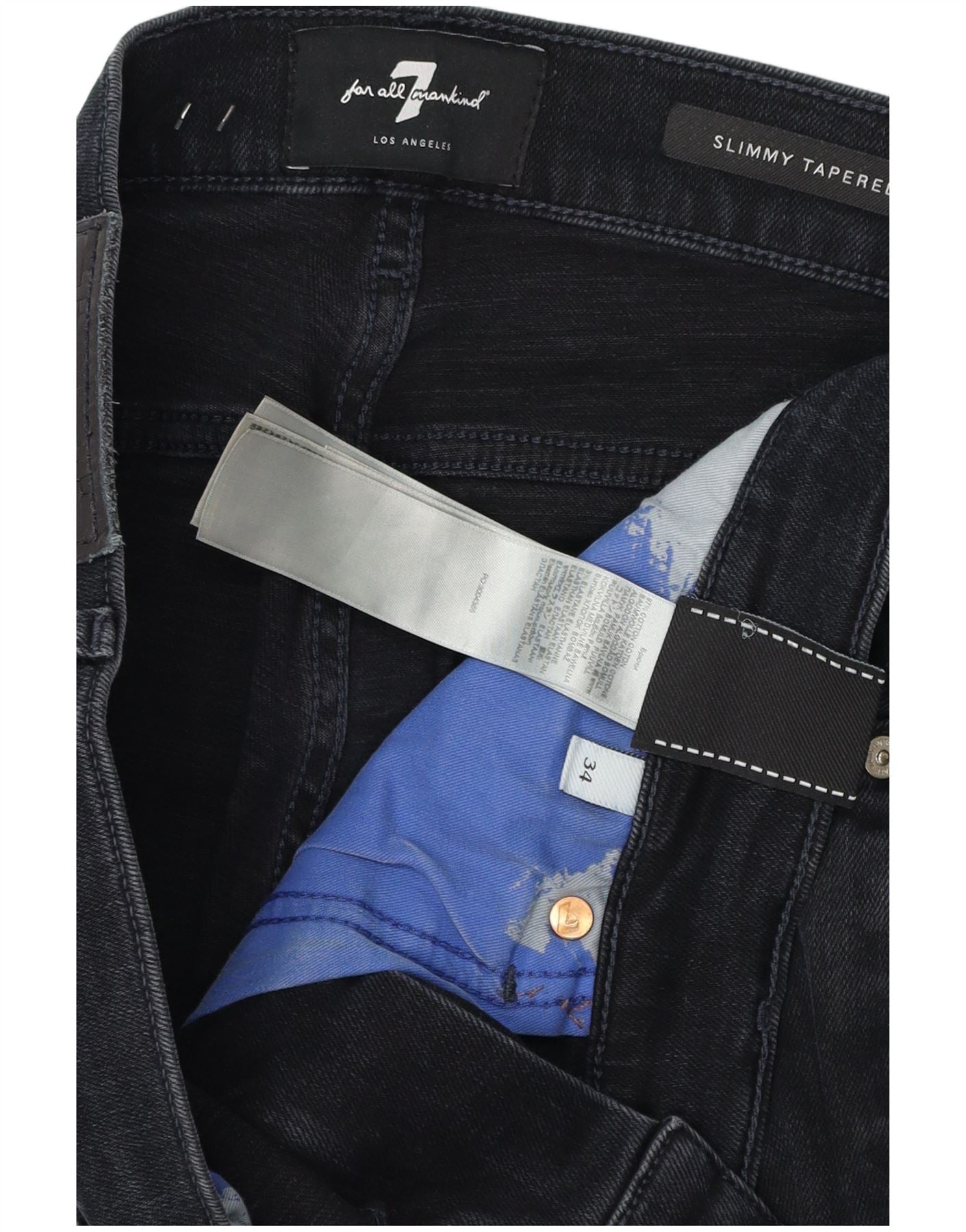 - AI Description: These 7 For All Mankind mens Slimmy Tapered jeans are presented in a rich navy blue denim. Crafted from a cotton blend, the fabric offers a comfortable slim fit with a subtle stretch. They feature a classic button closure and functional pockets. The legs are expertly tapered, narrowing towards the ankle for a contemporary silhouette. A discreet logo detail adds a signature touch.