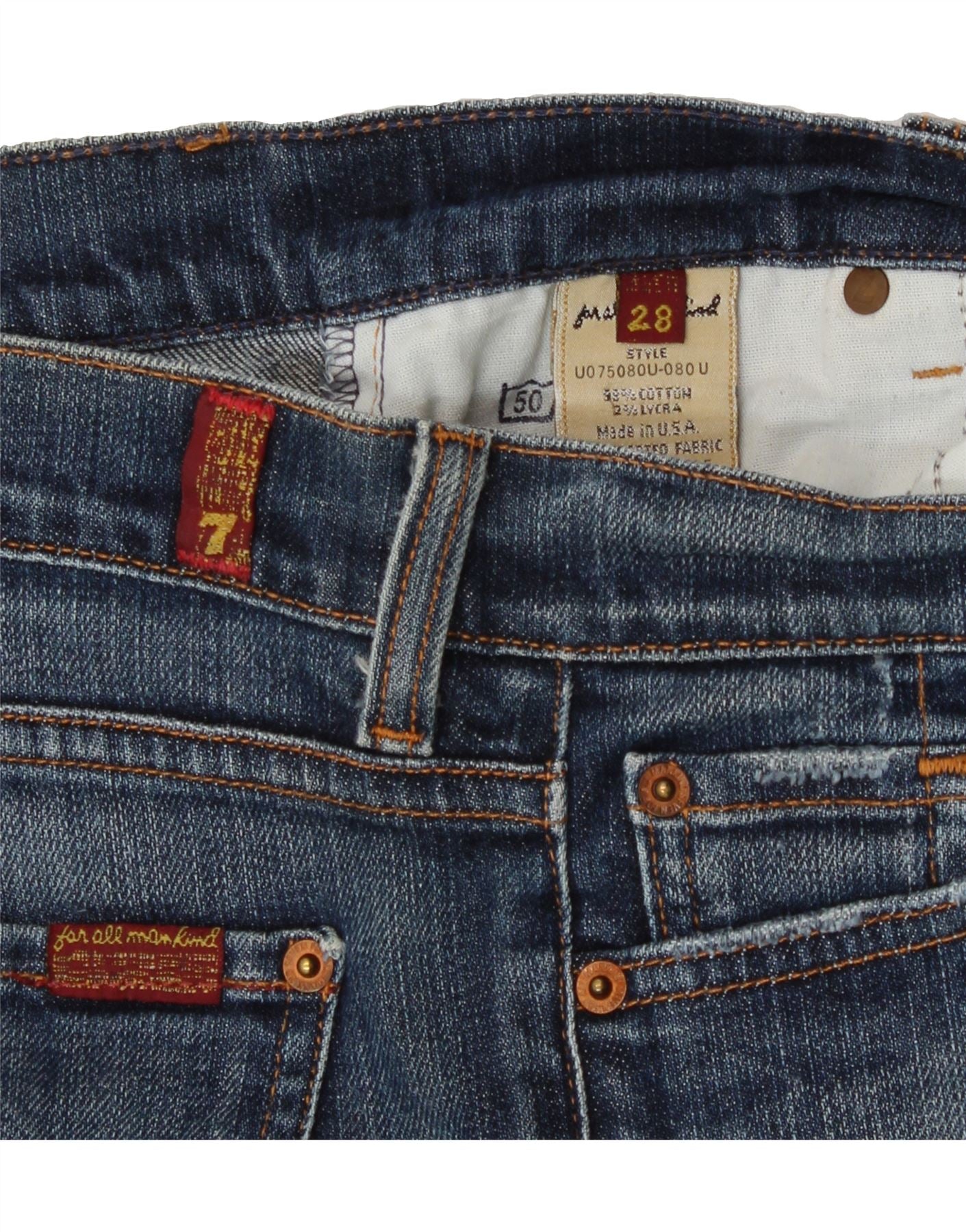 - AI Description: These pre-owned 7 For All Mankind bootcut jeans are crafted from a comfortable denim consisting of 98% cotton and 2% Lycra. The classic blue jeans, made in the USA from imported fabric, feature a button closure, a regular fit, and a low waist. These size 28 jeans also include practical pockets. In excellent condition.