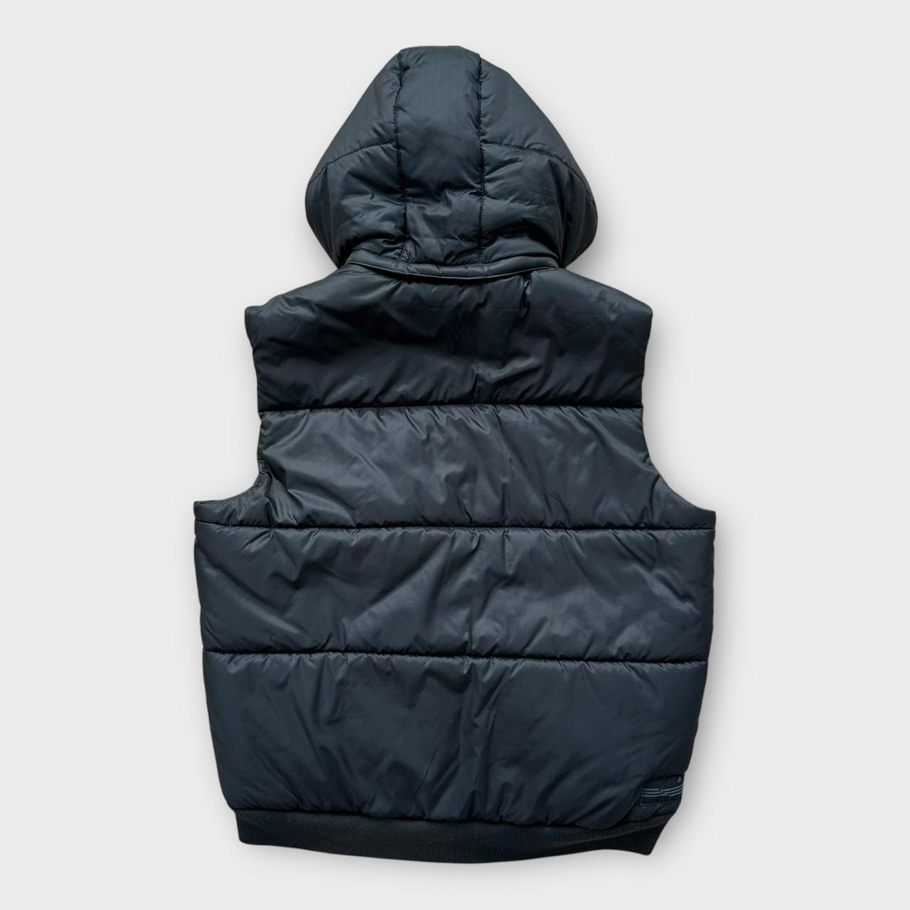 Vintage Adidas Pufferweste aus den frühen 2000ern im Y2K-Stil mit Reißverschluss in Schwarz, abnehmbarer Kapuze und gesticktem Logo auf der Brust