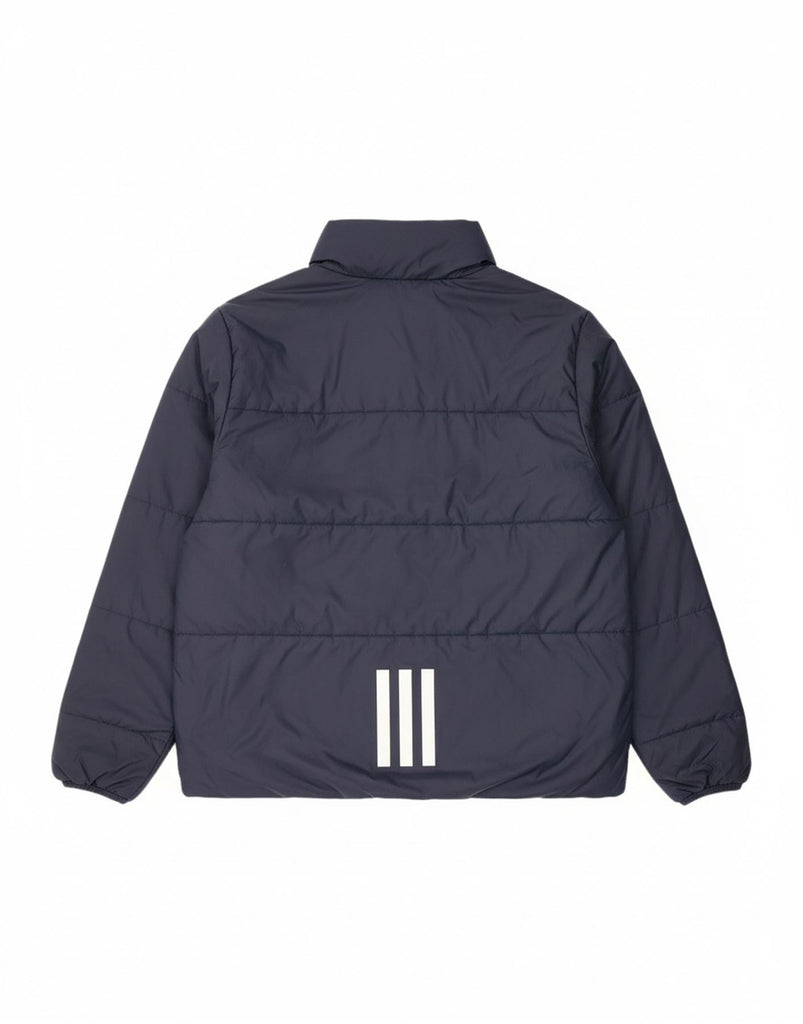 - AI Description: This Adidas mens padded jacket comes in a versatile navy blue. Its woven fabric is expertly padded for warmth and comfort. A full zip closure extends to the high neck, offering secure fastening. The integrated hood provides extra protection from the elements. Long sleeves and a regular fit ensure comfortable wear. A subtle logo detail completes this modern, practical design.