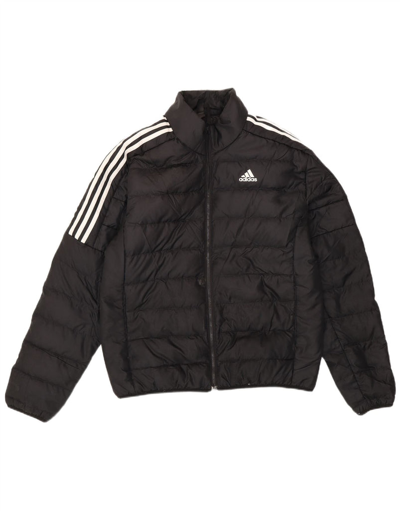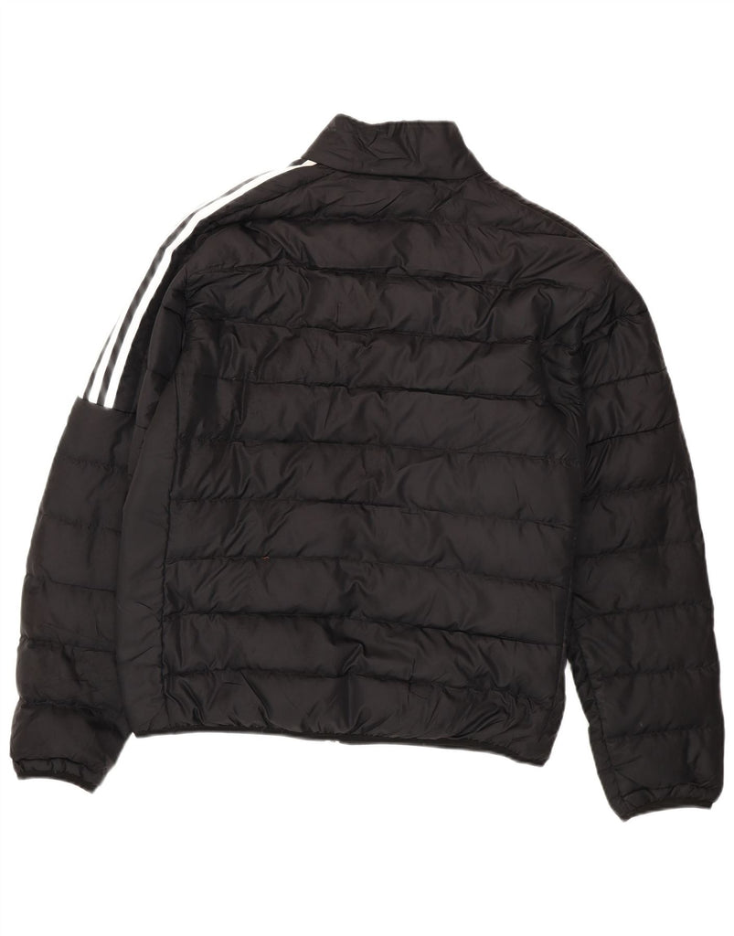 - AI Description: This Adidas mens padded jacket is crafted from black polyester with a smooth finish. It features a lightweight down and feather filling for thermal warmth. The collared neckline and long sleeves offer classic coverage. A full zip closure secures the front. Its regular fit ensures comfortable wear. Practical pockets provide storage. A subtle logo accent completes the sporty design.