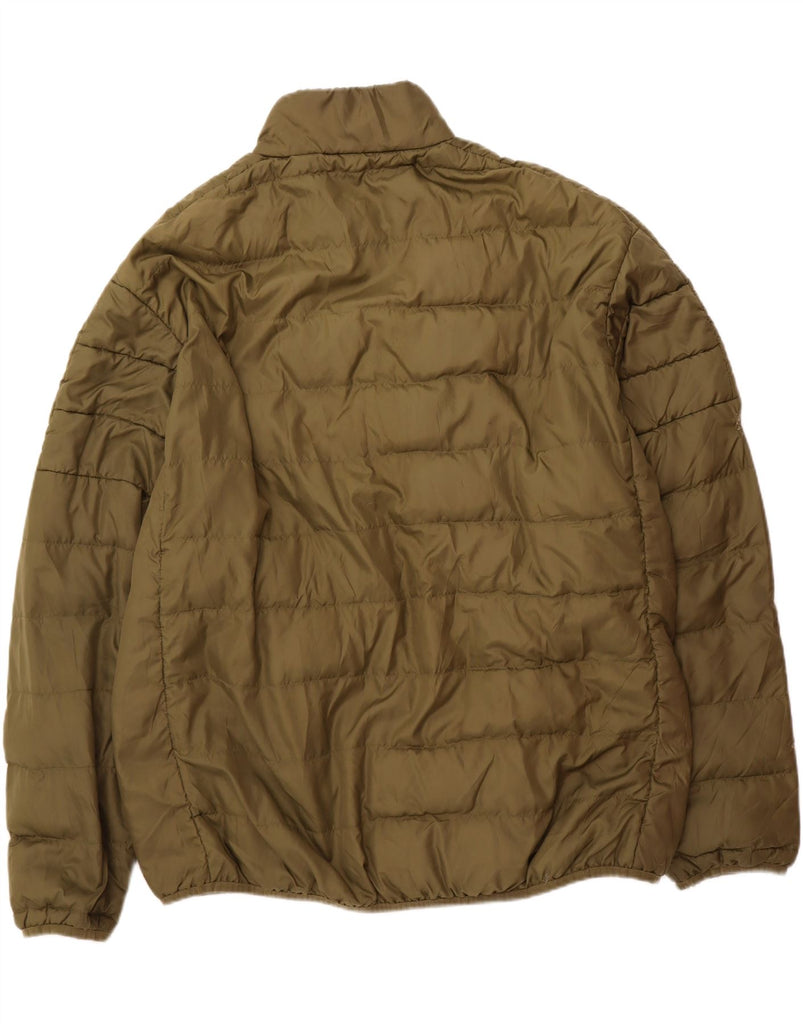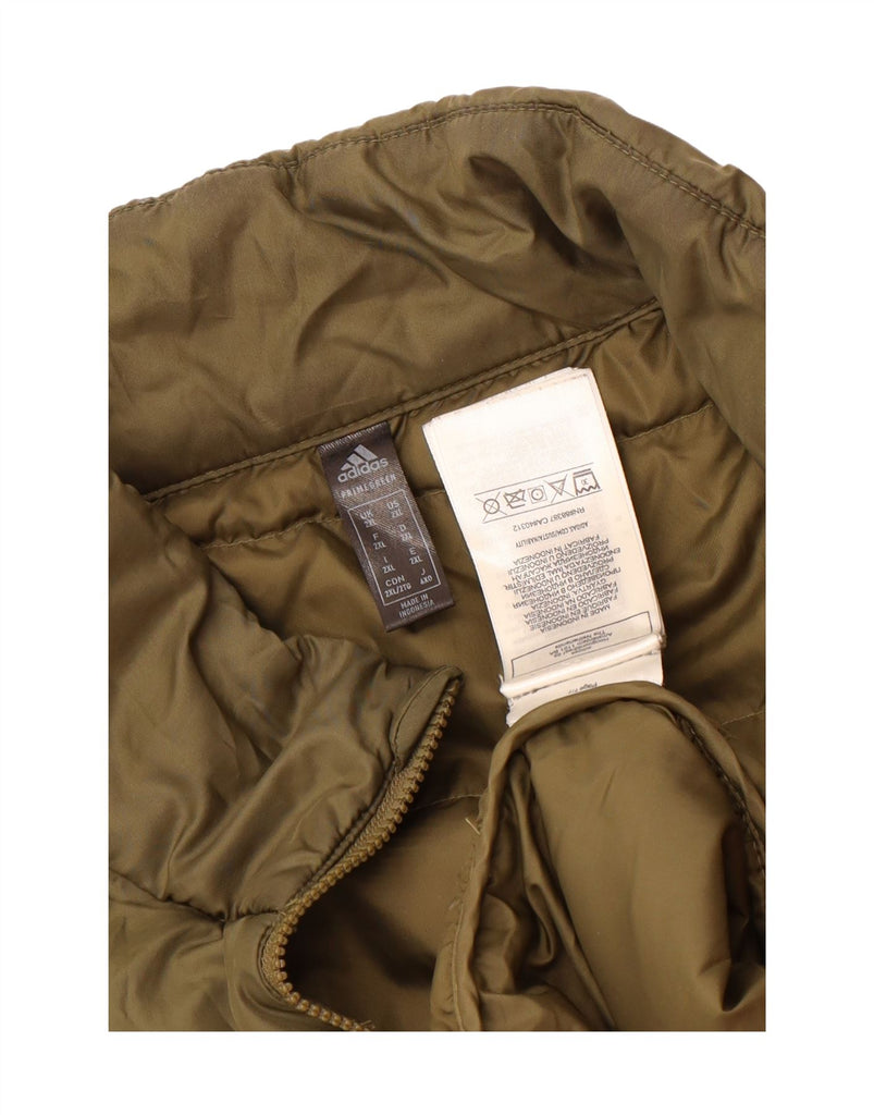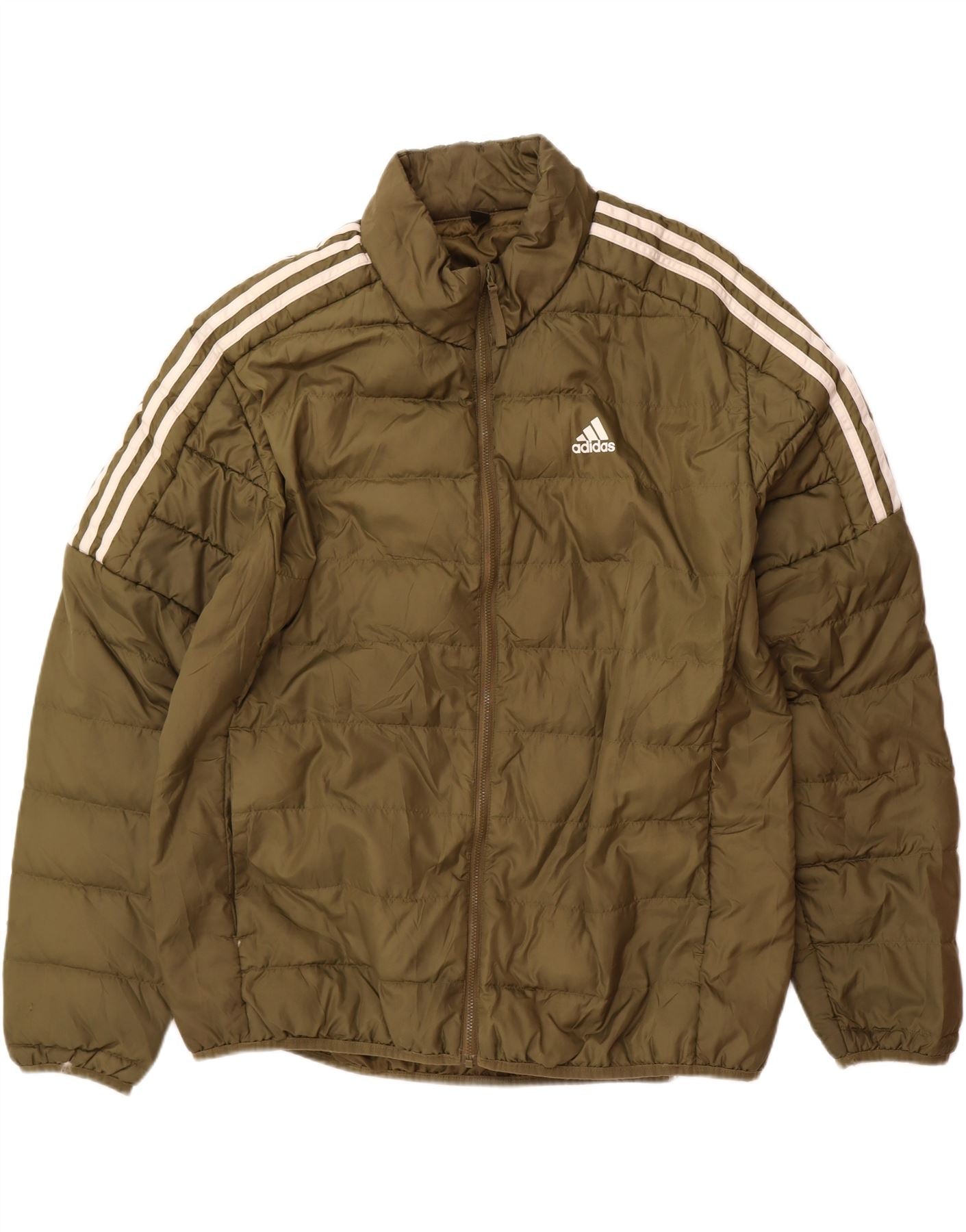 - AI Description: This Adidas men's padded jacket is crafted from 100% recycled polyester, featuring a woven, padded texture in a versatile green hue. It has a collared neckline and a full zip closure for practical wear. The long sleeves and regular fit ensure comfort and warmth. Lightweight and thermal, it also includes a subtle logo accent for signature styling.