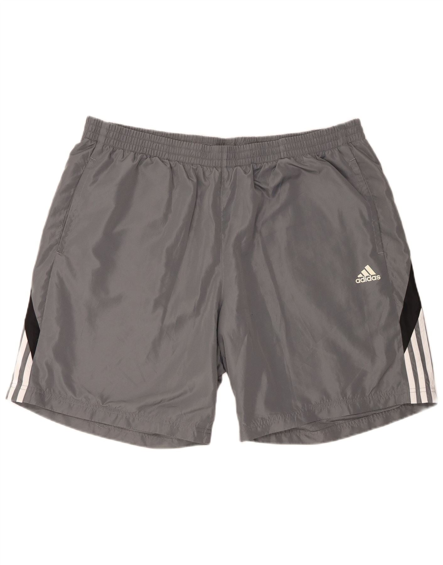 - KI-Beschreibung: Diese Adidas-Herrenshorts sind aus einem grauen, gewebten Stoff gefertigt und eignen sich ideal zum Laufen. Sie verfügen über eine athletische reguläre Passform mit einem bequemen elastischen Bund zum Anziehen. Schwarze Seitenteile sind mit klassischen weißen Streifen versehen. Das Design umfasst praktische Taschen und ein durchgehendes Futter für Komfort. Ein markantes Adidas-Logo setzt einen charakteristischen Akzent.