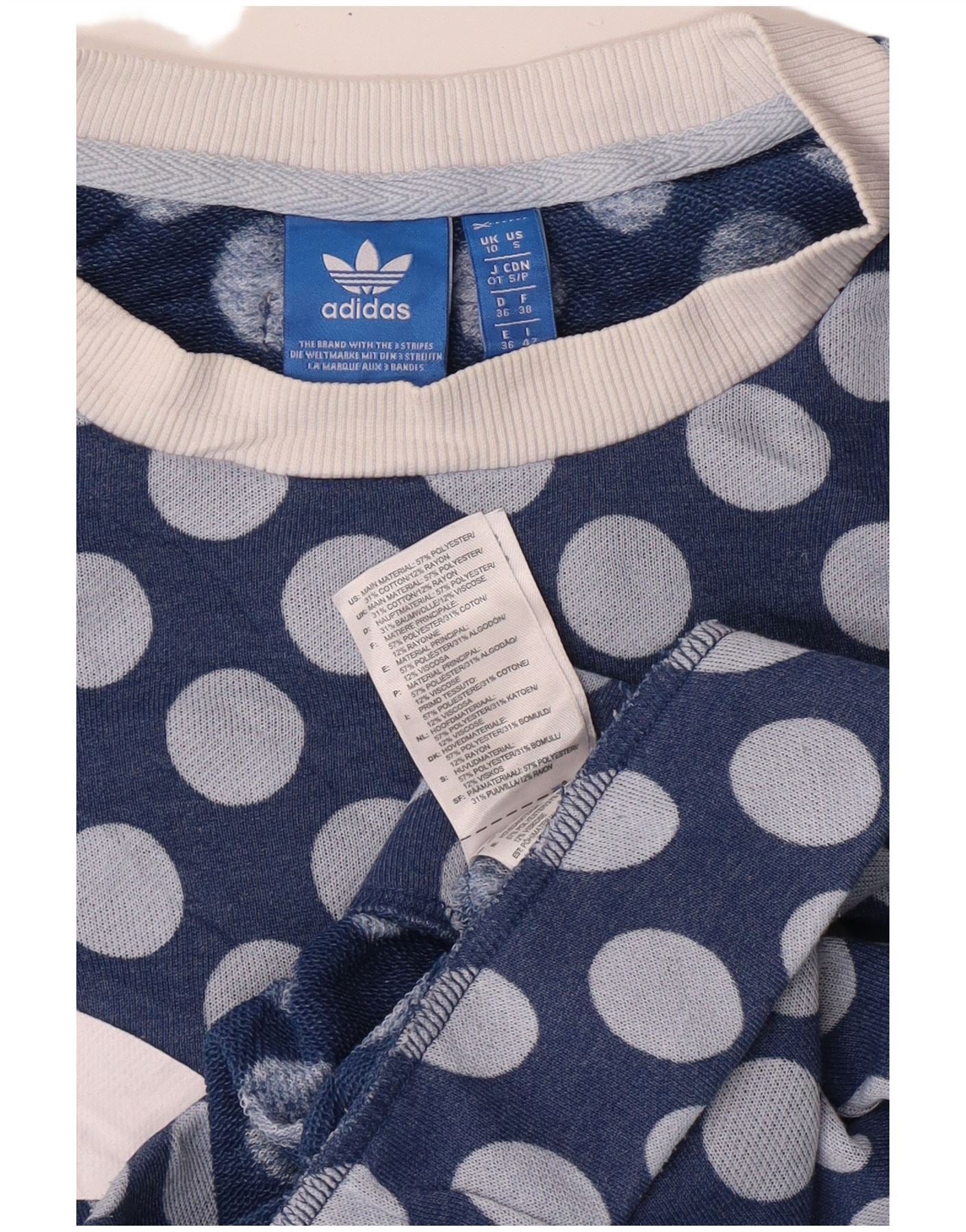 - KI-Beschreibung: Dieser Adidas-Sweatpullover für Damen besteht aus einer Strickmischung aus Polyester und Baumwolle. Es verfügt über ein kräftiges marineblaues und hellblaues Tupfenmuster. Der Rundhalsausschnitt und die langen Ärmel sorgen für eine klassische Silhouette. Dieser Pulloverstil hat eine normale Passform für angenehmen Tragekomfort. Das grafische Tupfenmuster verleiht diesem sportlichen Trefoil Crew Sweatshirt eine verspielte Note.