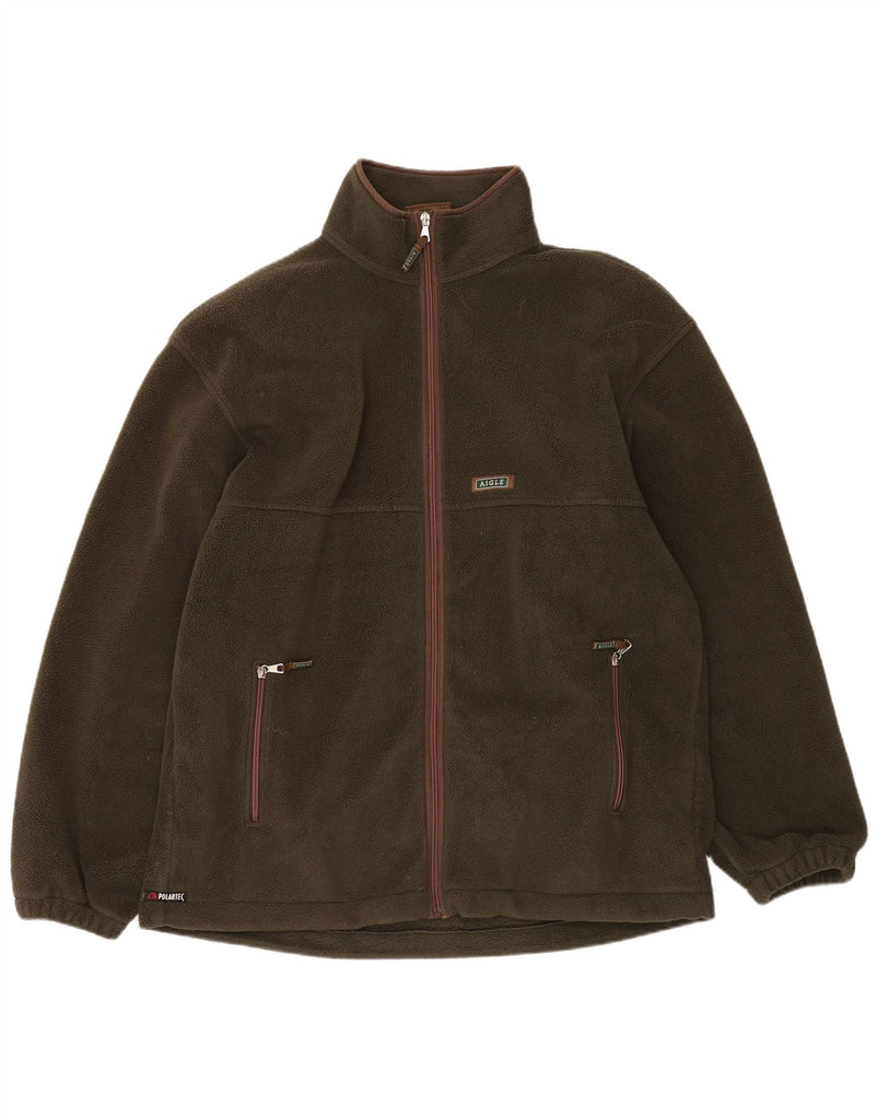 - AI Description: This Aigle men's Fleece Jacket is crafted from soft khaki microfleece, offering warmth and comfort. It features a classic collared neckline and a full zip closure for versatile wear. Long sleeves provide ample coverage. Zipped pockets offer practical storage. The regular fit ensures comfortable layering. This padded style combines warmth with a timeless design.