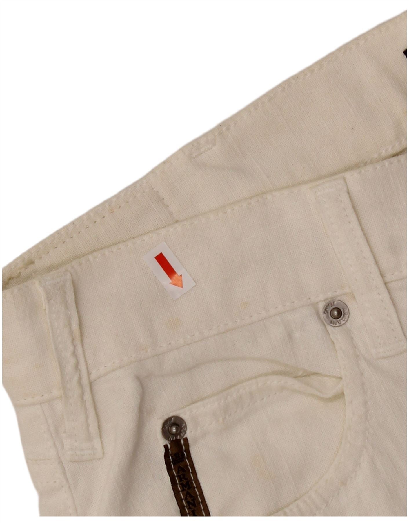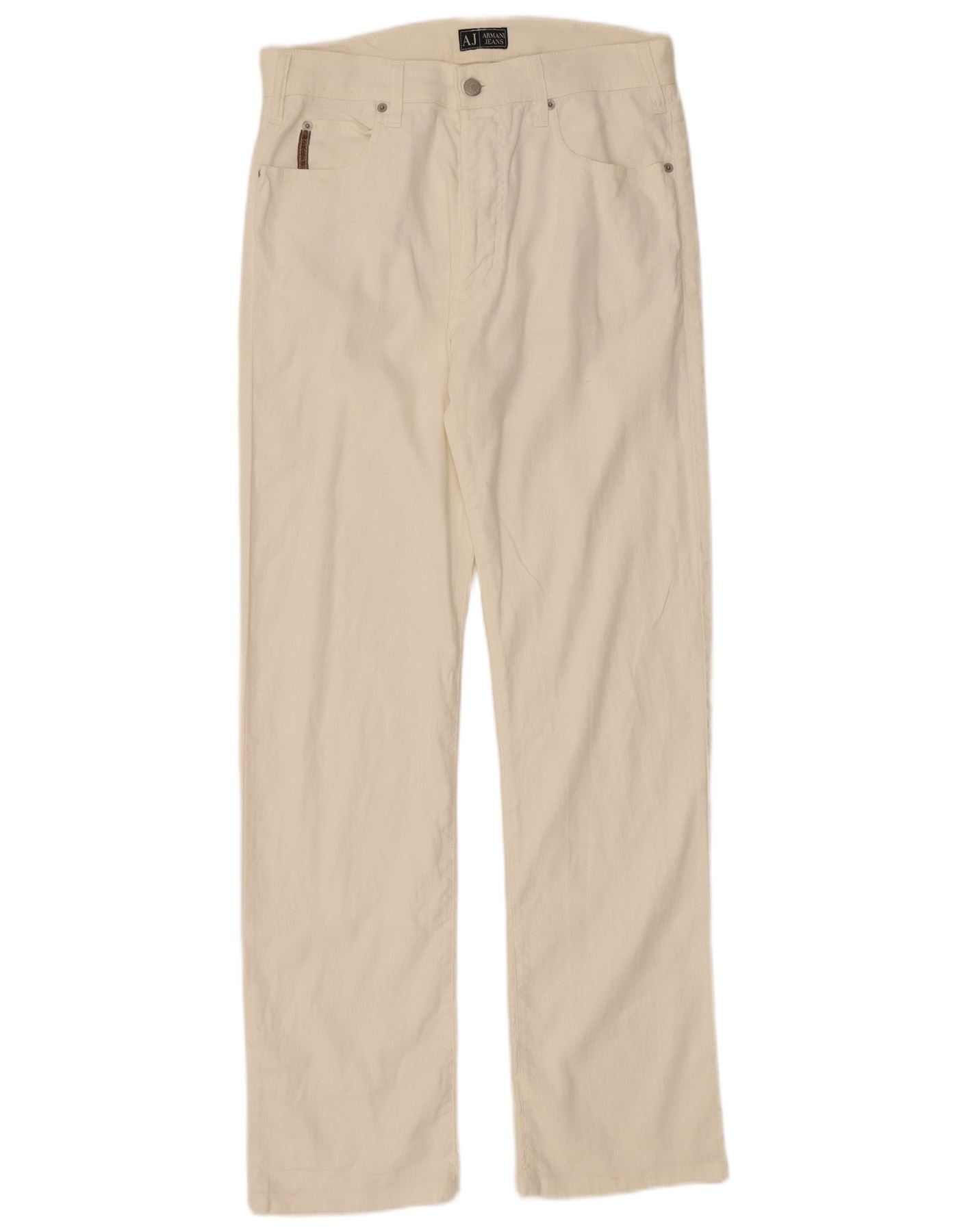 - AI Description: This Armani women's straight jeans are crafted from soft off-white corduroy, offering a distinctive texture. They feature a comfortable mid-rise waist and a classic button closure. The straight leg cut ensures a regular, relaxed fit. Practical pockets are included, and a subtle logo accent adds a signature touch. Designed for comfort, these jeans blend classic style with everyday wearability.