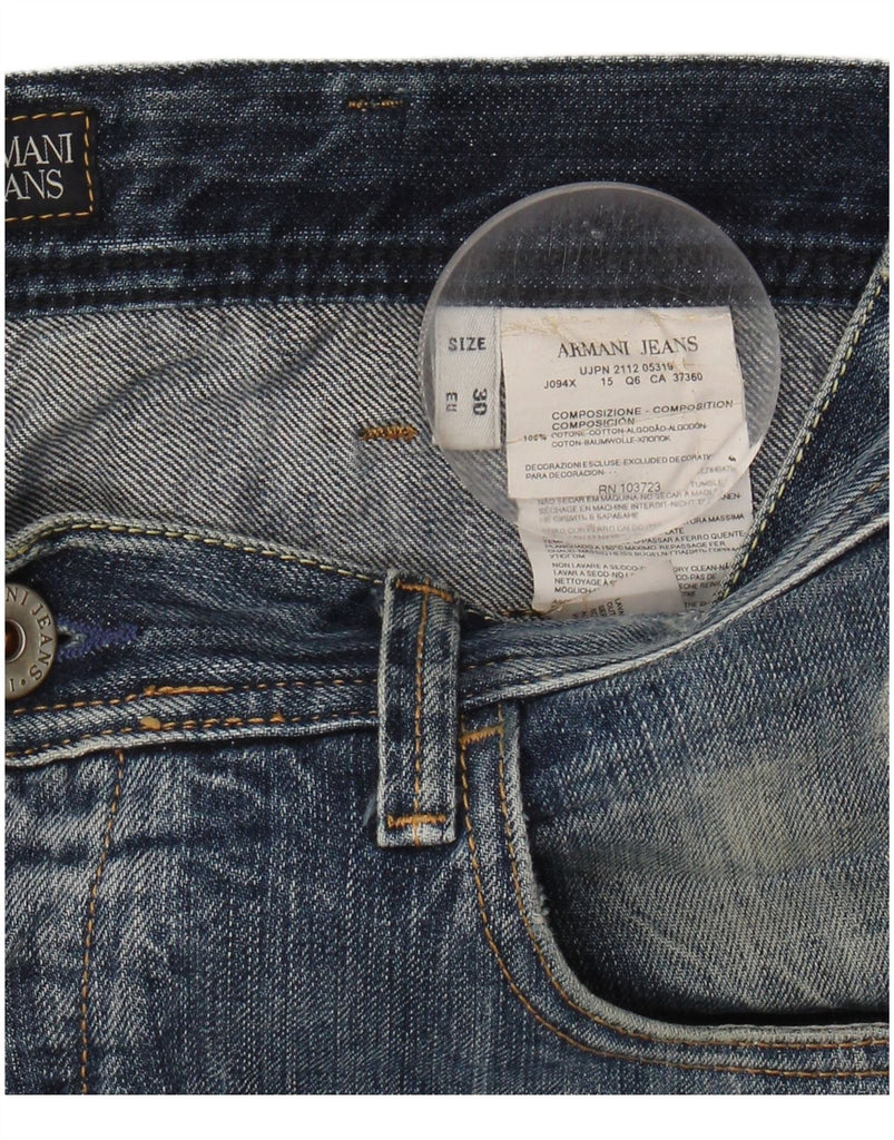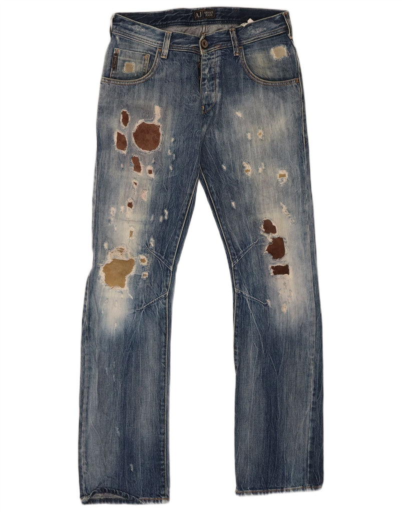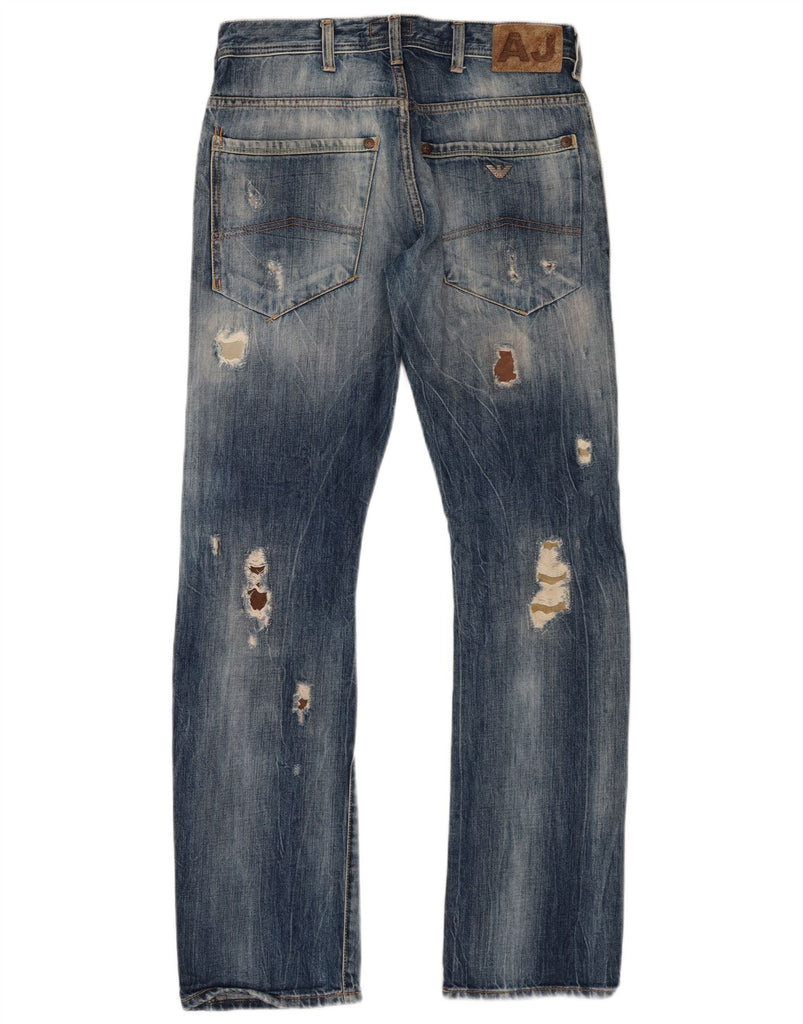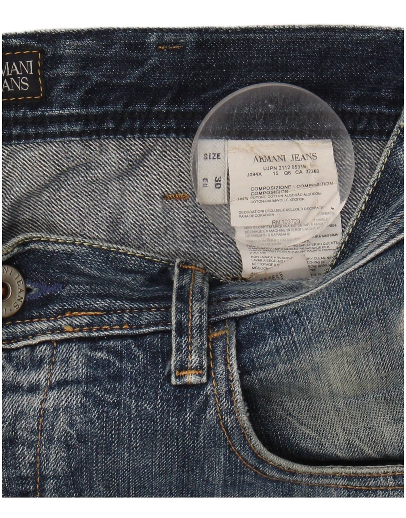 - AI Description: This Armani Jeans mens straight jeans are crafted from 100 percent cotton denim. The fabric features a distressed finish, adding a rugged texture. They offer a regular fit with straight legs for a classic silhouette. A button closure secures the front. Practical pockets complete the design, blending utility with a grunge aesthetic.
