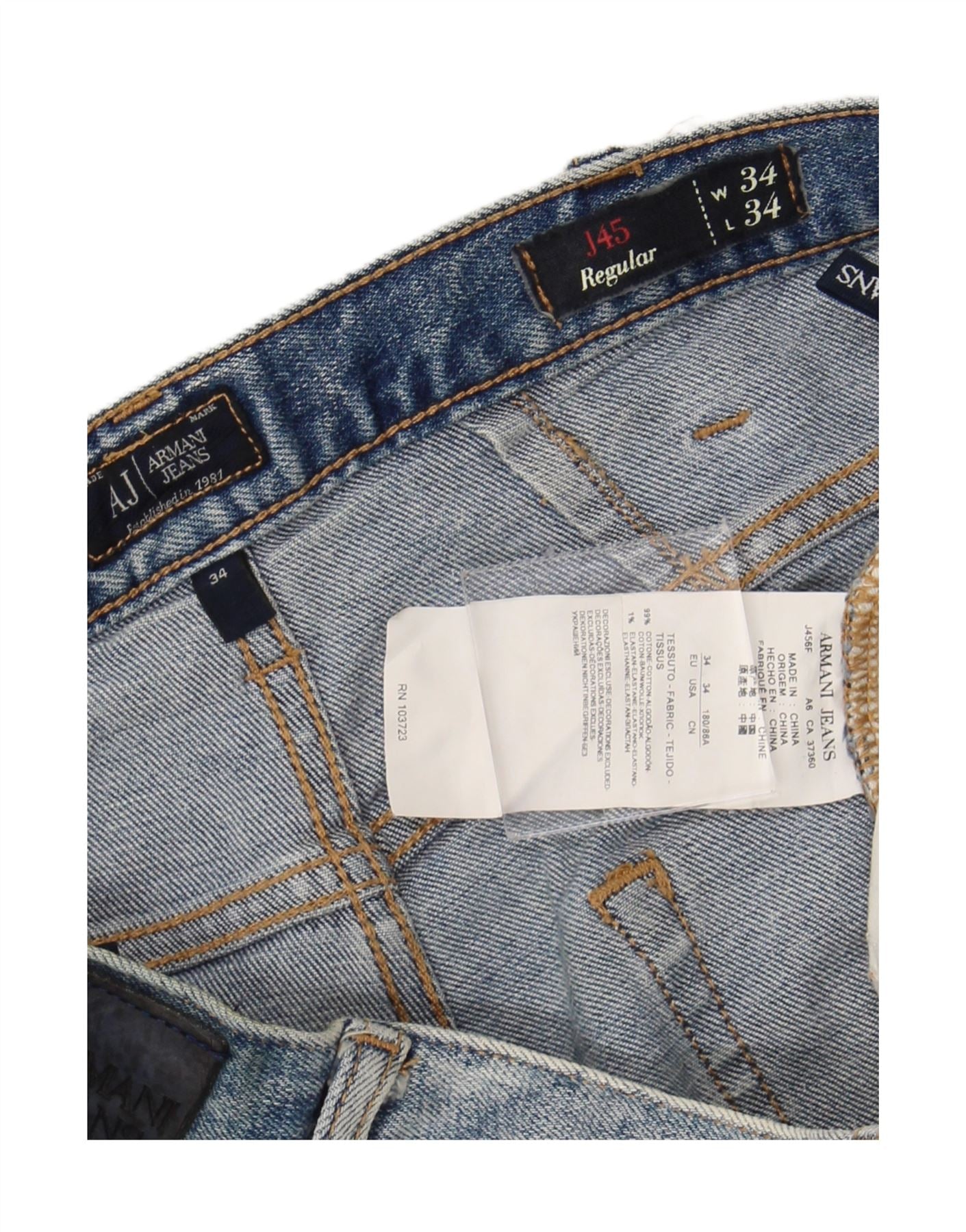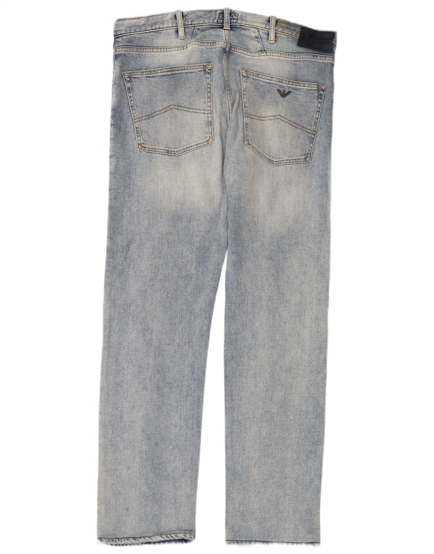 - AI Description: These Armani mens Straight Jeans are crafted from durable blue denim, a blend of 98 percent cotton and 2 percent elastane. This offers both comfort and a slight stretch. They feature a classic straight leg and a regular fit for timeless appeal. The button closure ensures a secure fastening. Practical pockets are included, alongside a subtle brand logo accent. This J45 Regular model embodies a classic style, perfect for everyday wear.