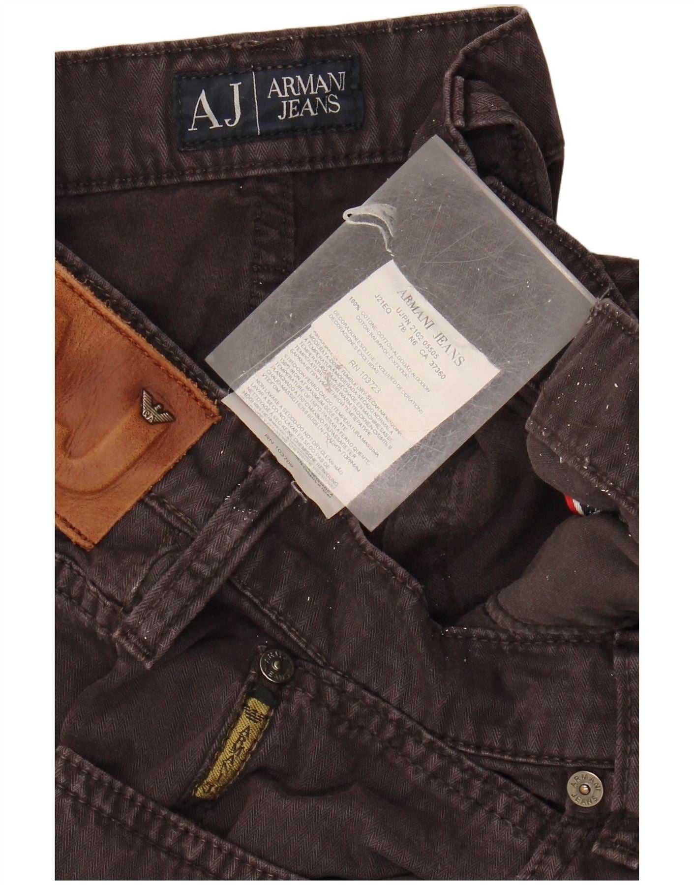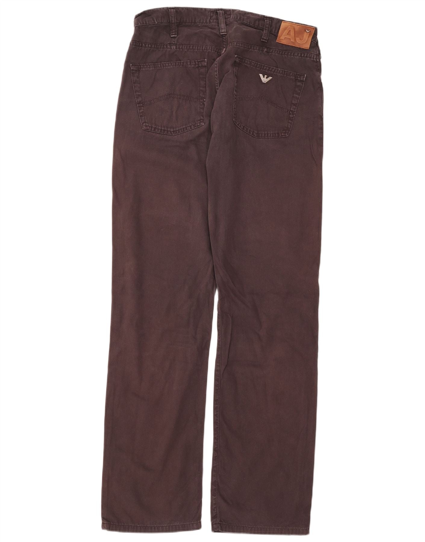 - AI Description: These Armani Jeans mens corduroy jeans are crafted from 100 percent cotton, offering a rich maroon hue and a soft, textured feel. They feature a classic regular fit, ensuring comfort and a timeless silhouette. The straight leg design provides a relaxed yet smart appearance. A button closure secures the front, complemented by practical pockets. The classic style is enhanced by subtle button accents.