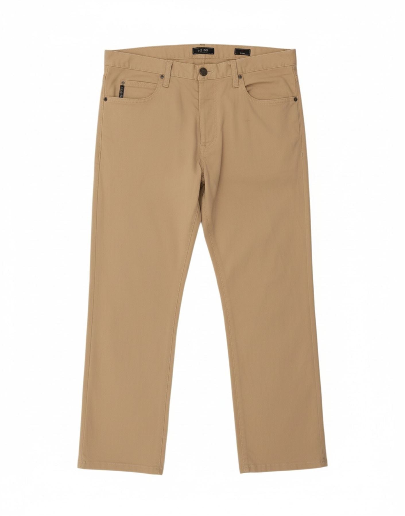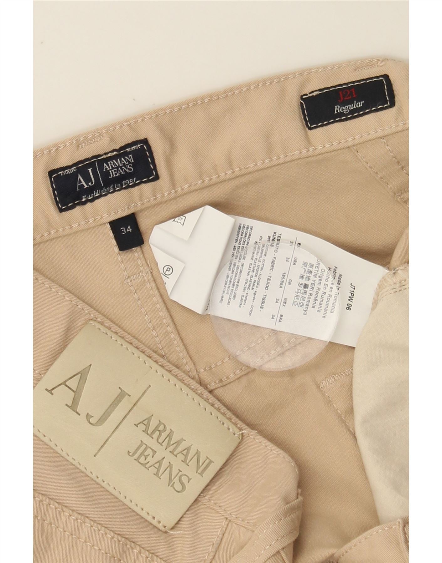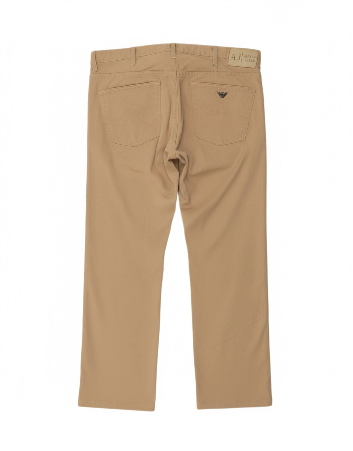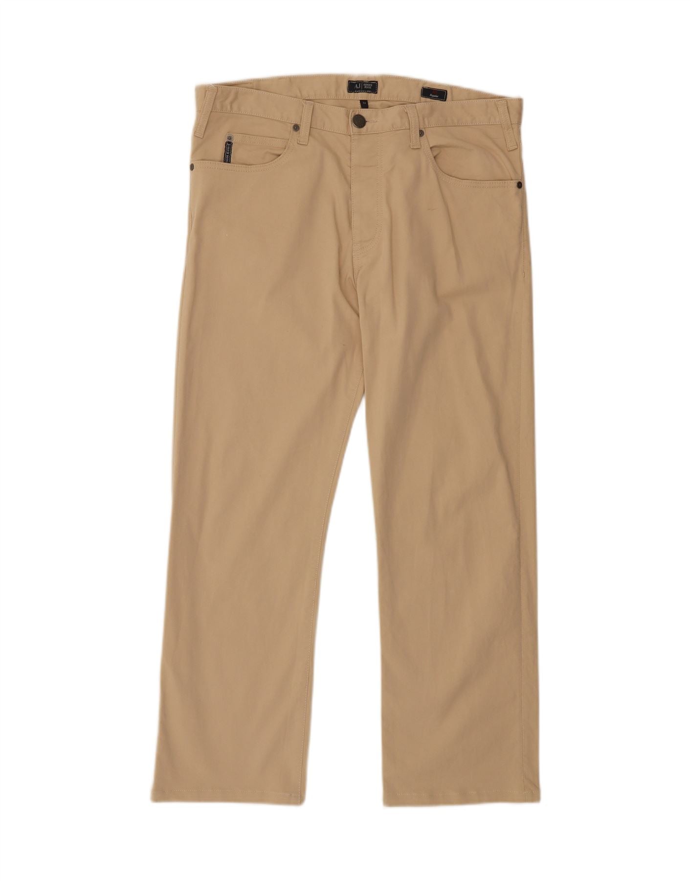 - AI Description: These Armani Jeans mens straight jeans are expertly crafted from 100 percent cotton denim. The beige fabric offers a classic, versatile look. They feature a regular fit for comfortable wear, providing a timeless silhouette. A button closure secures the waist, maintaining a clean line. Practical pockets are included for convenience. A subtle branded logo detail adds a signature touch, affirming the garments quality.