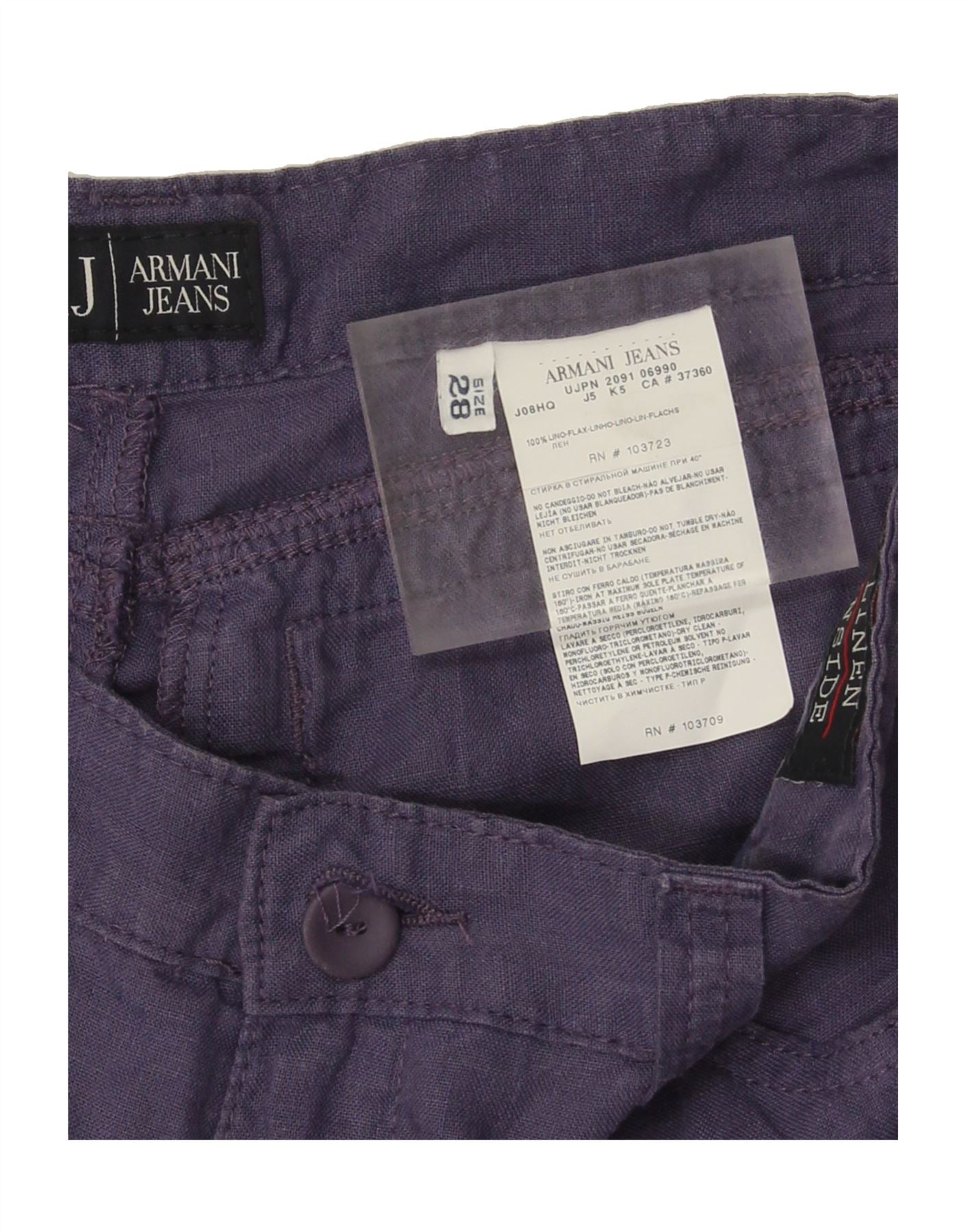 - AI Description: Elevate your wardrobe with these pre-owned Armani Jeans trousers. Crafted from 100% linen in a distinctive purple woven fabric, they offer a comfortable regular fit with a wide leg. Featuring a button closure and practical pockets, these size 28 trousers show minor signs of wear and minor stains at the waist, front and back. Washing instructions: Machine wash and iron at 40°C.