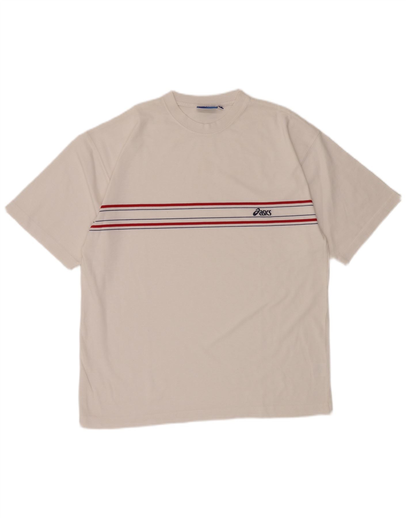 Home > Vintage Asics-Kleidung > Vintage-Asics-Bekleidung für Herren > T-Shirts > ASICS Herren-T-Shirt-Oberteil, großes, weiß gestreiftes Polyester