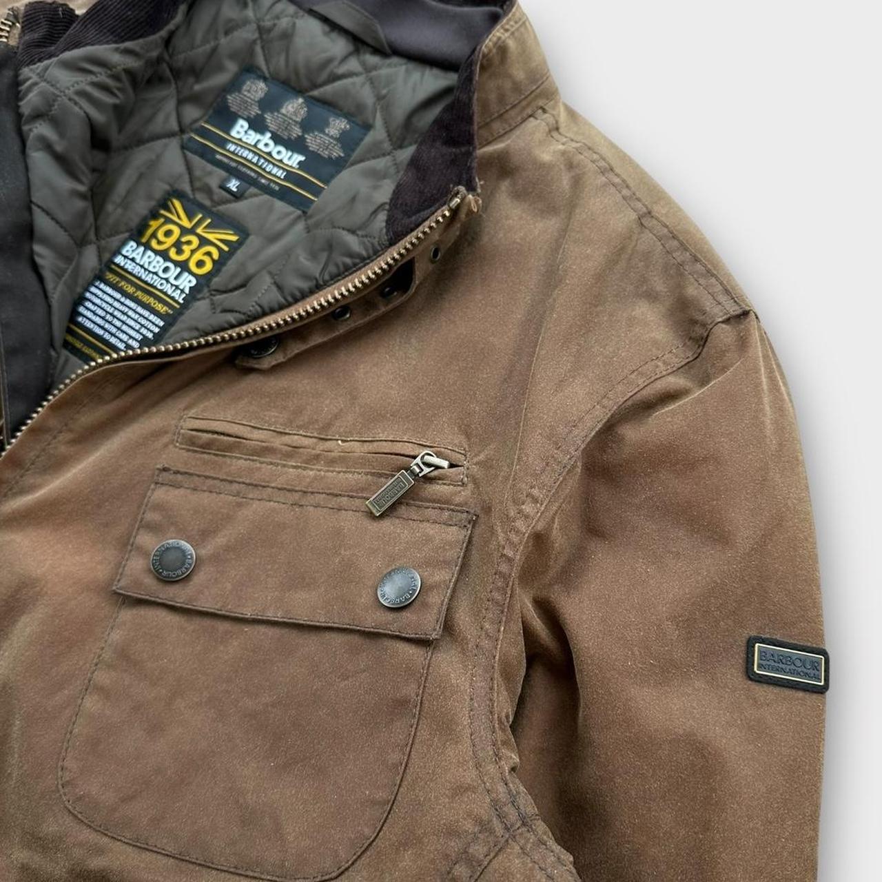 Klassische internationale gesteppte Wachsjacke von Barbour in Braun mit mehreren Taschen und kleinem Logo im Armlogo