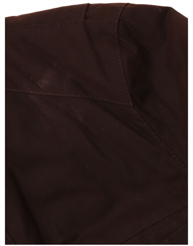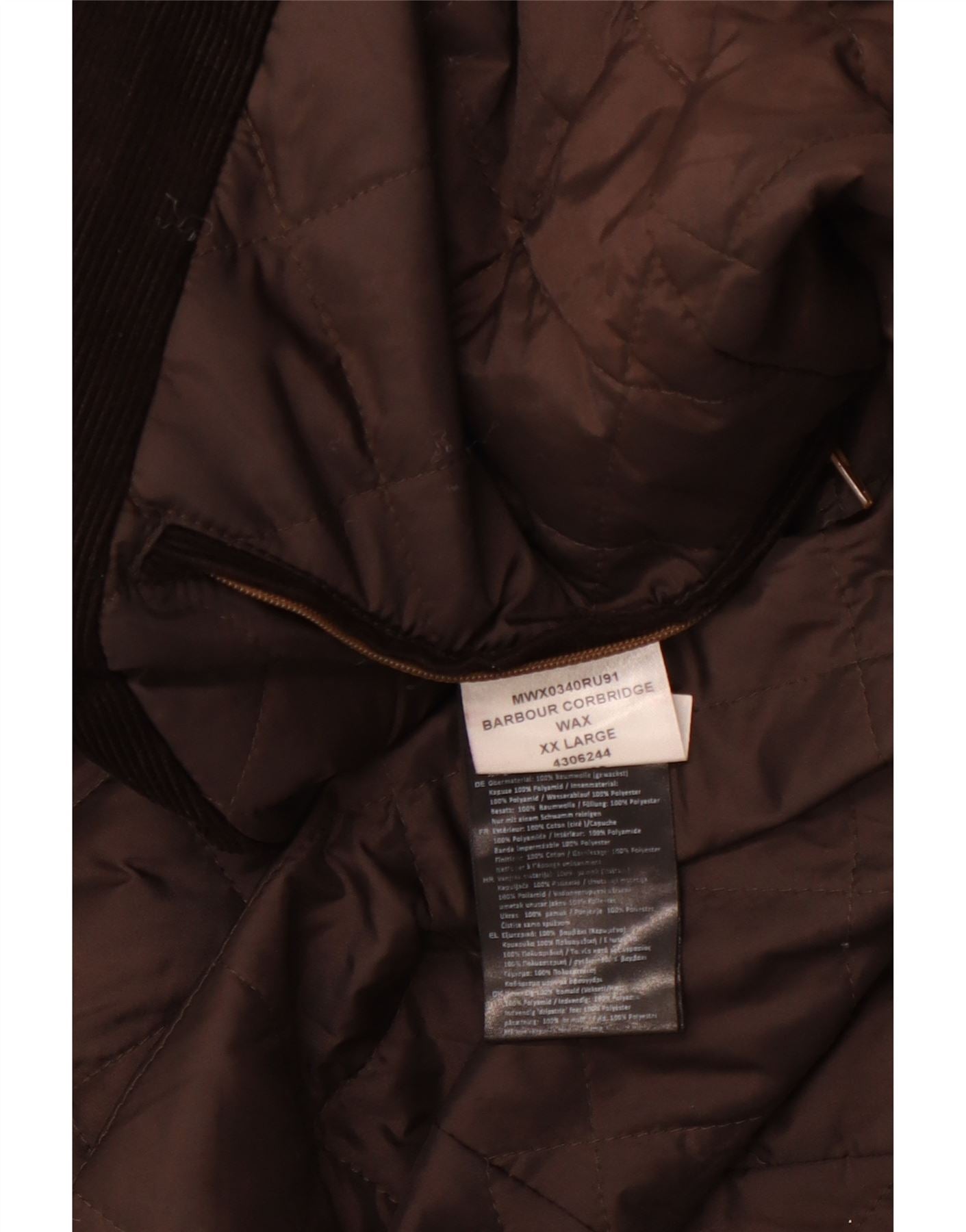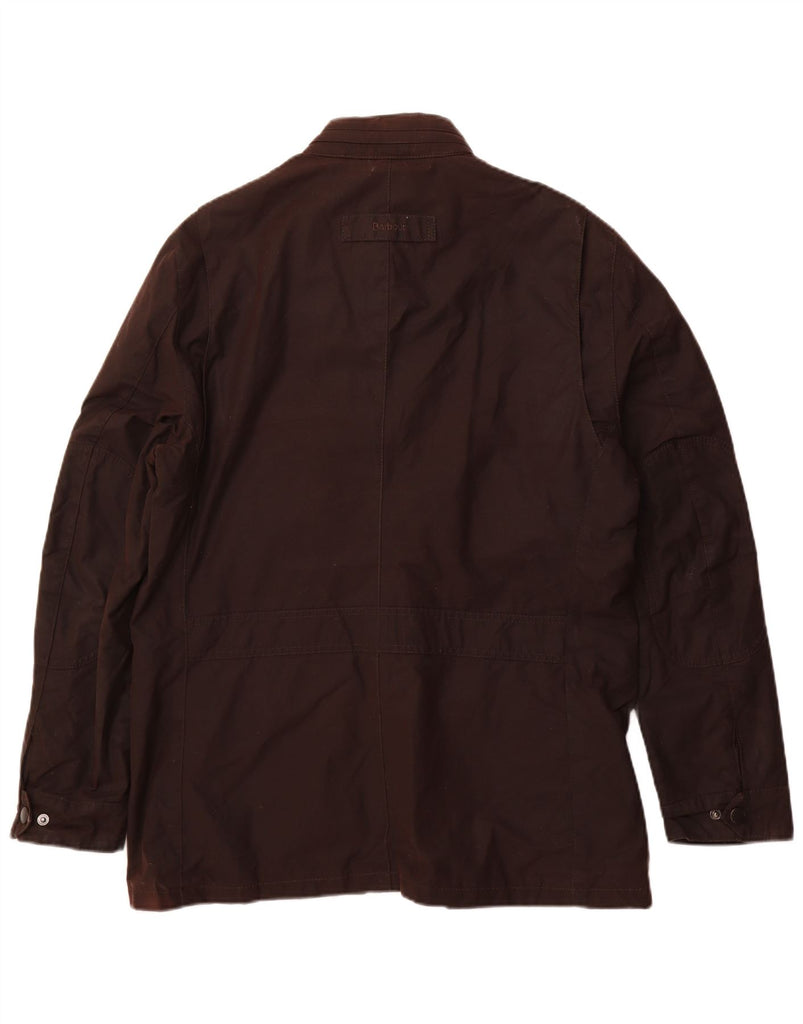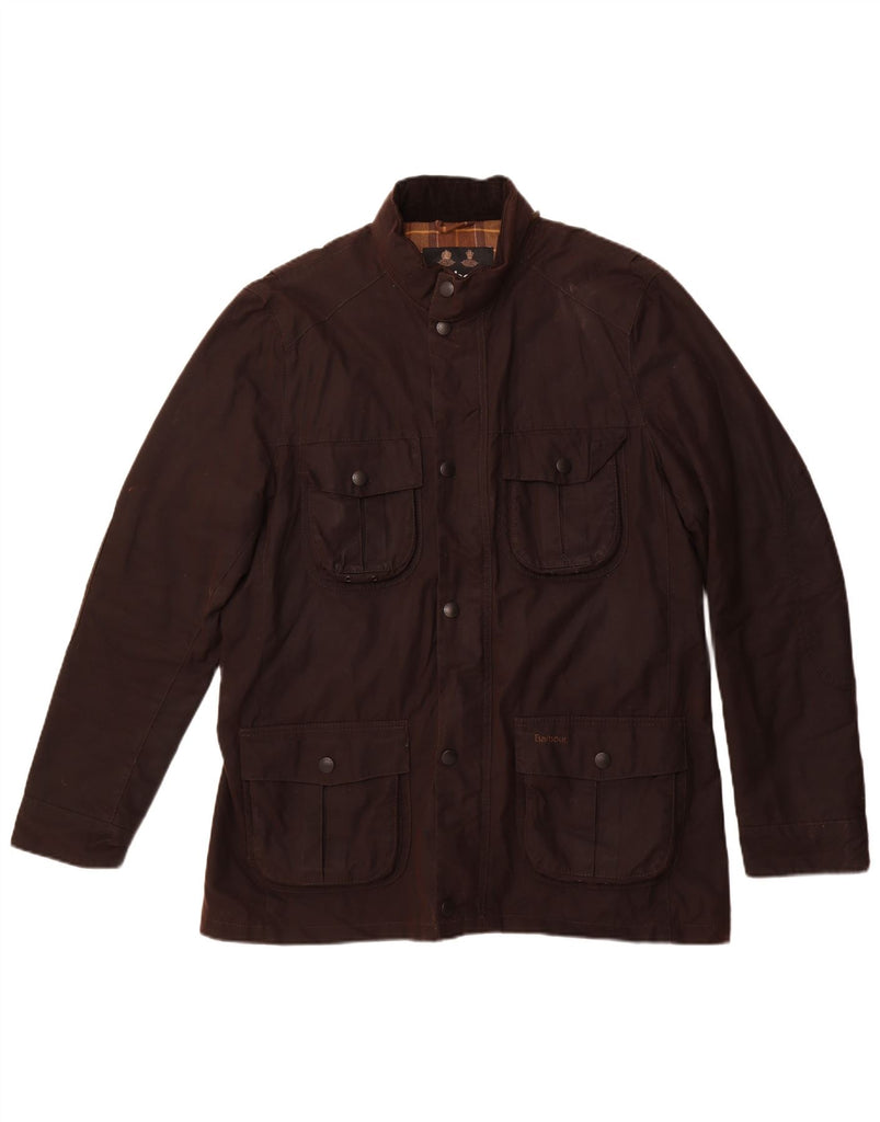- AI Description: This Barbour mens waxed cotton jacket is crafted from durable brown cotton. It features a classic collared neckline and long sleeves. The full zip and button closure offer robust protection. Multiple pockets provide practical utility. Its regular fit ensures comfortable wear, making it ideal for outdoor pursuits. The water resistant finish adds further functionality.