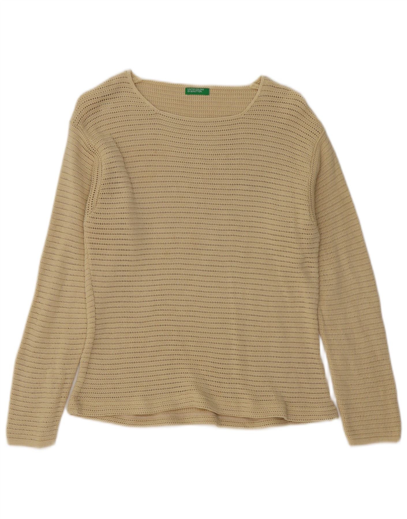BENETTON Damen-Häkelpullover mit U-Boot-Ausschnitt, UK-Gr. 12, mittelbeige Baumwolle