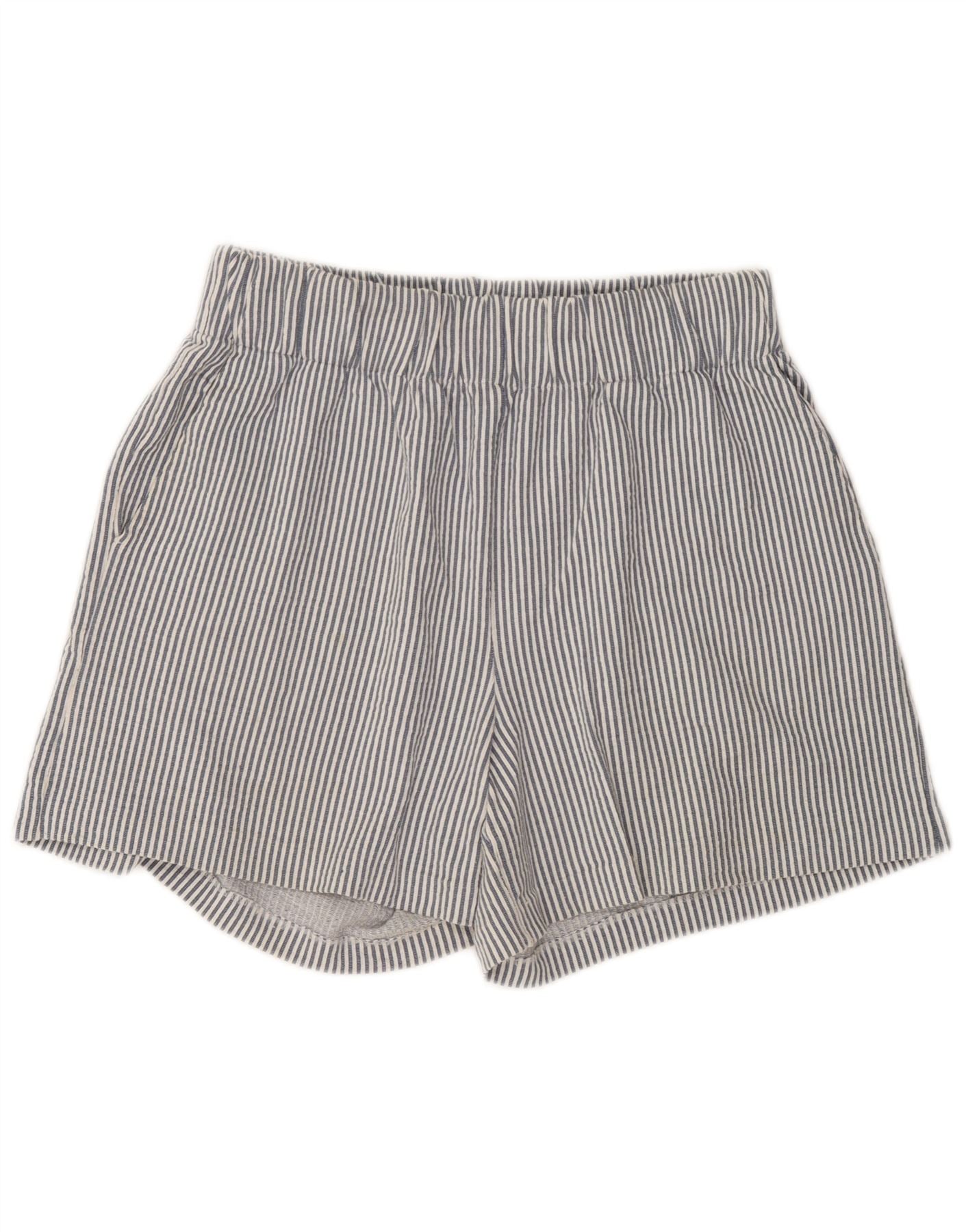 Benetton Damen-Shorts mit hoher Taille, mittelgroß, W30, blaue Nadelstreifen-Baumwolle
