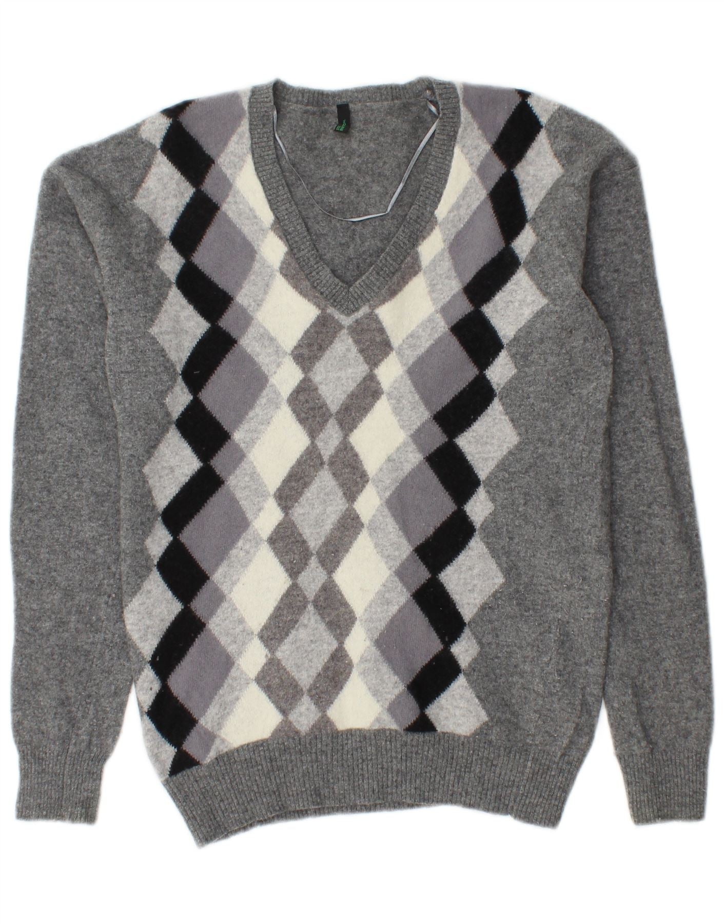 BENETTON Damen-Pullover mit V-Ausschnitt, Gr. 10, Größe S, graue Argyle-/Diamantwolle