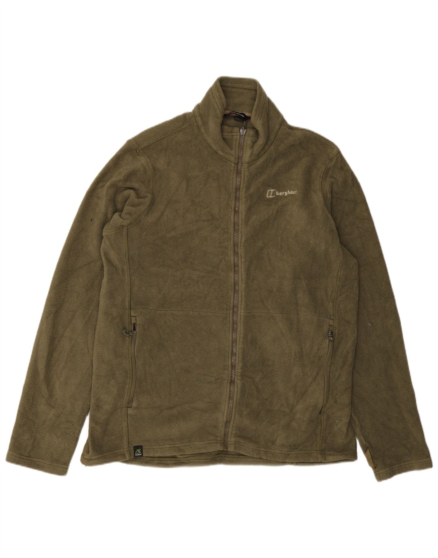 - AI Description: This Berghaus mens fleece jacket is crafted from 100 percent polyester fleece, offering warmth and a soft texture. It comes in a versatile green hue. The collared neckline and full zip closure provide practical coverage. Long sleeves ensure comfort. A regular fit allows for easy layering. It features convenient pockets and a subtle brand logo accent. Ideal for sports and outdoor activities.