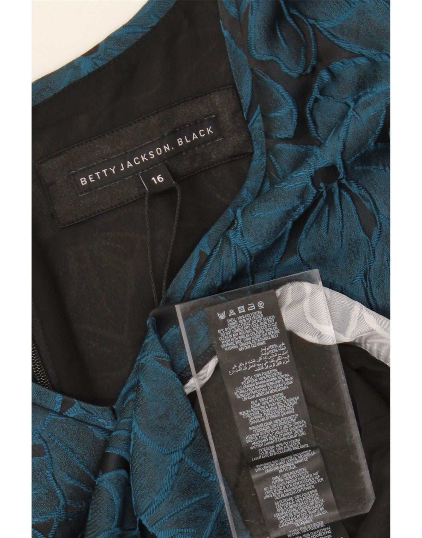 - AI Description: This pre-owned Betty Jackson pencil dress is perfect for weddings or special occasions. Crafted from a blue floral jacquard polyester, it features a V-neck, short sleeves, and a regular fit. The dress is fully lined with polyester and boasts a belted waist with a bow accent. A zip closure ensures a secure fit. This size 16 dress is in excellent condition and can be machine washed. Accented with buttons and with machine wash instructions, this dress offers both style and convenience.