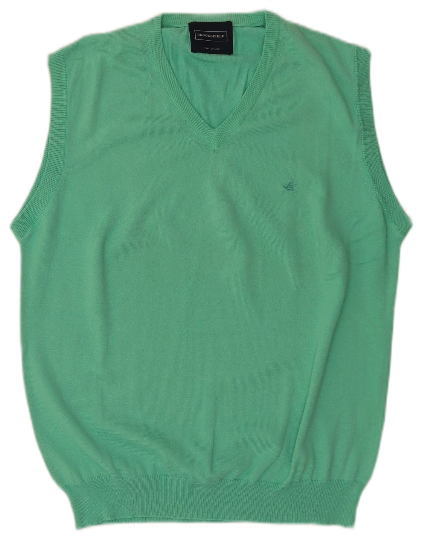 - AI Description: This Brooksfield mens knit vest is crafted from 100 percent cotton, offering a soft, breathable texture. Its classic V-neckline and sleeveless design provide a versatile, comfortable fit. The pullover style ensures easy wear. A regular fit maintains a smart silhouette. A subtle logo detail adds a refined brand touch to this timeless green garment.
