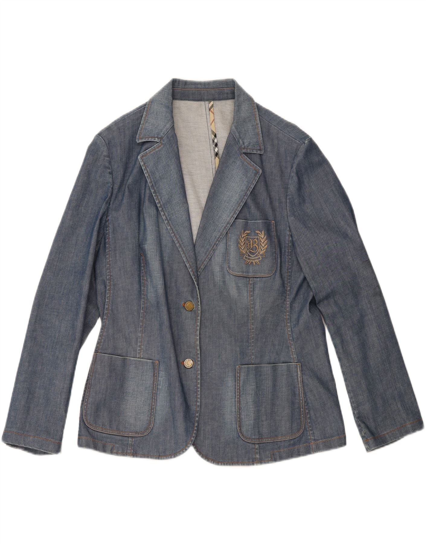 - AI Description: Elevate your wardrobe with this classic Burberry denim blazer jacket. Crafted from 98% cotton, this blue, long-sleeved jacket features a collared neckline and button closure. The regular fit and lined interior ensure comfort and style. Accented with button details and practical pockets. Pre-owned in excellent condition with minor fading on the denim fabric. A timeless addition to any woman's collection.
