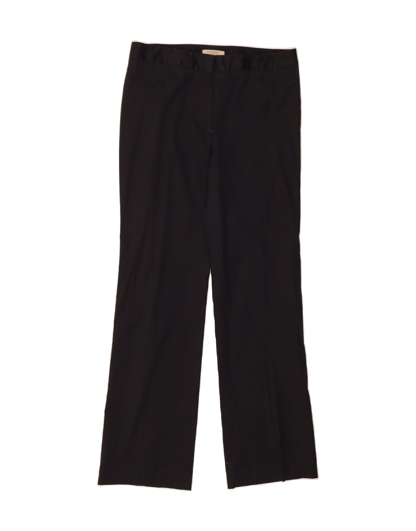 - AI Description: Classic Burberry trousers in pre-owned excellent condition. These black, woven trousers feature a straight leg and regular fit. They have a zip closure, pockets and stretch for comfort. Label size 10. Note minor fading on the right leg and backside, plus slight loose stitching near the zipper.