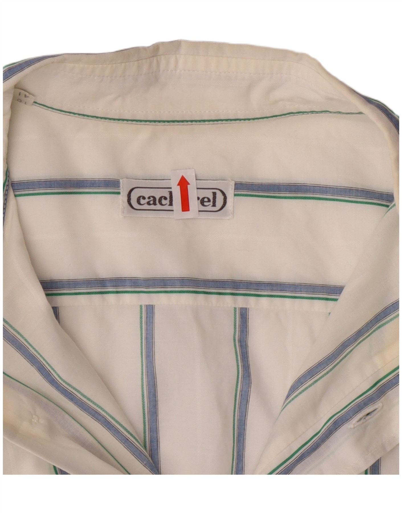 - AI Description: This Cacharel men’s shirt features an off-white woven fabric with a distinct striped pattern. The collared neckline and short sleeves offer a classic silhouette. A button-up front ensures a clean, traditional finish. Designed for a regular fit, it includes functional pockets for practicality. The geometrical stripes provide a subtle visual interest.