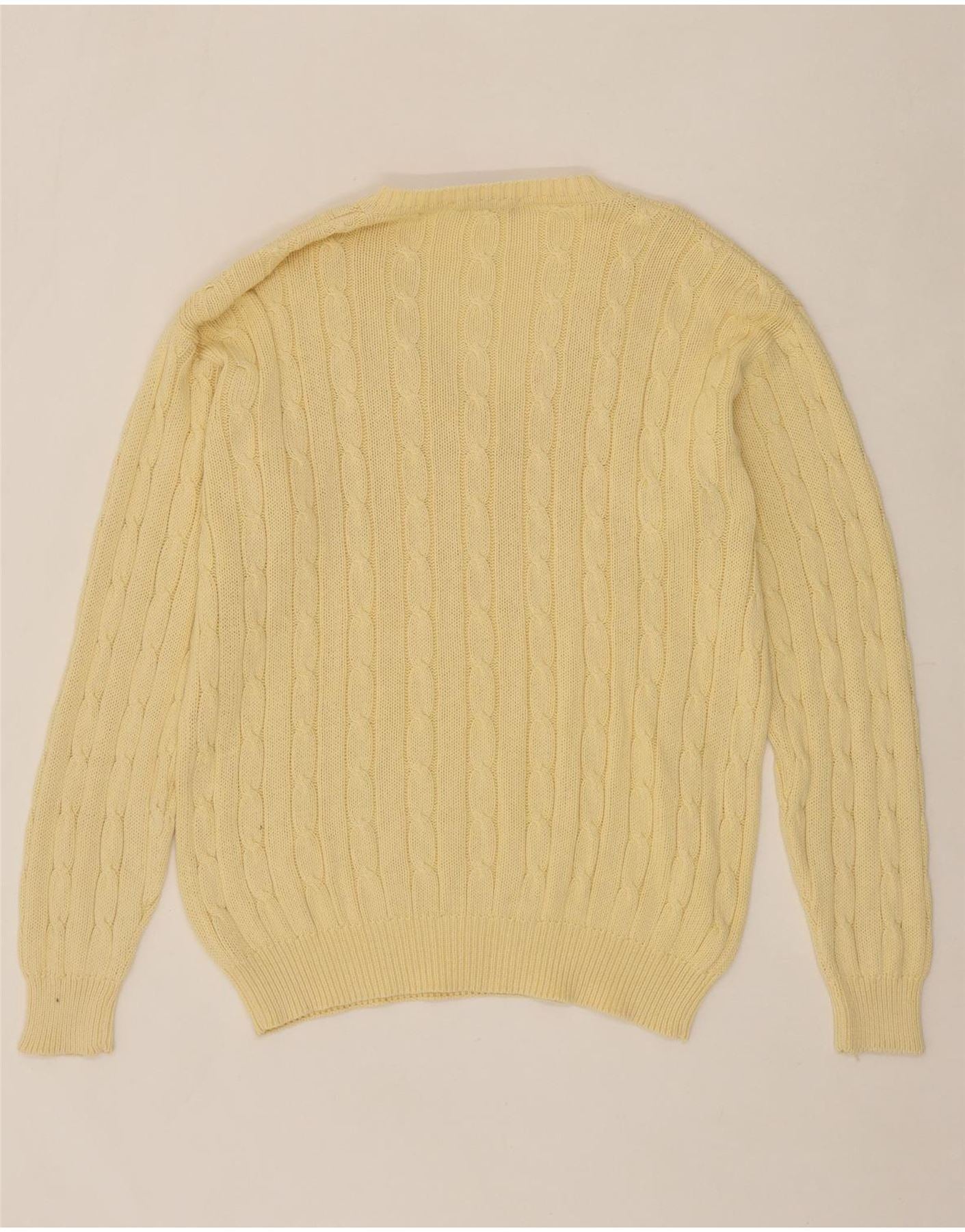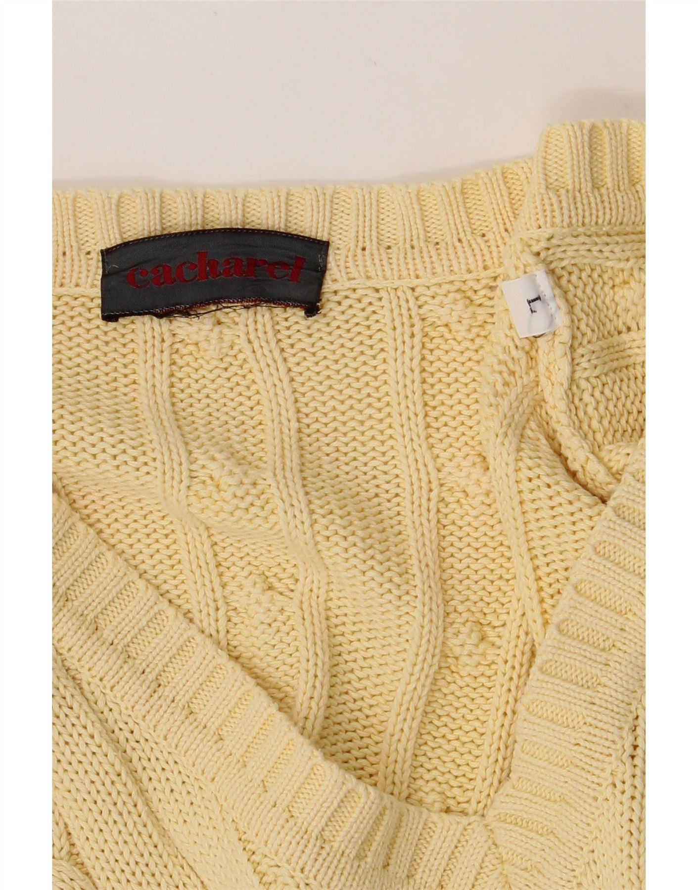 - AI Description: This pre-owned Cacharel sweater is crafted in Italy from a soft wool blend (85% wool, 15% acrylic). The yellow cable knit jumper features a V-neck, long sleeves and a regular fit. A subtle logo adds a touch of branding. This vintage piece, in size L, embodies a preppy style and is perfect for adding a pop of colour to your wardrobe. Recommended care: Hand wash only.