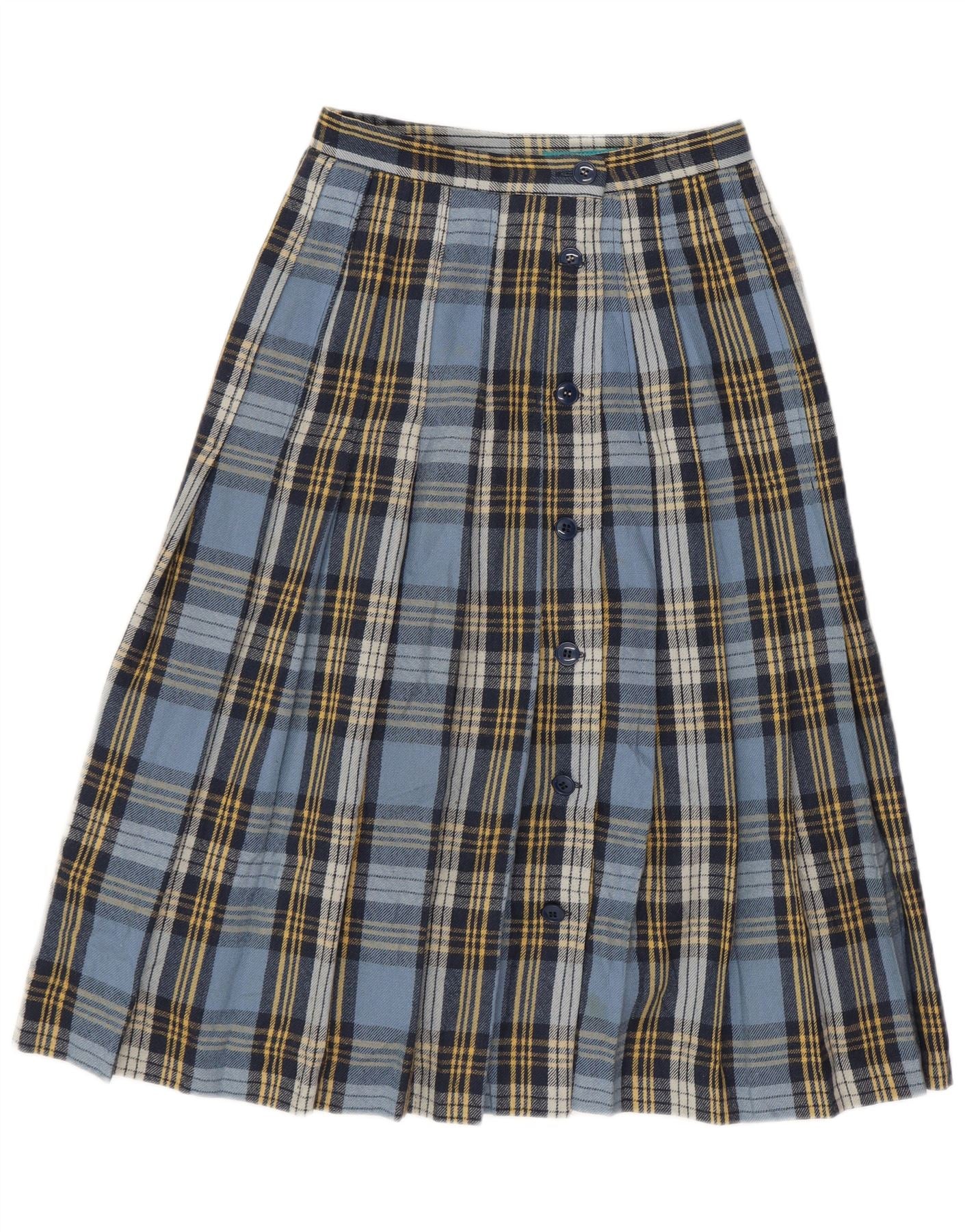 - KI-Beschreibung: Dieser Cacharel-Faltenrock für Damen ist aus einem gewebten Stoff mit einem klassischen Karomuster gefertigt. Sein mehrfarbiges Design vereint Blau-, Marine- und Gelbtöne. Der Rock ist durchgehend mit eleganten Falten versehen, die eine anmutige, fließende Silhouette schaffen. Der durchgehende Knopfverschluss vorne sorgt für einen traditionellen Touch und sorgt für eine normale Passform. Dieser klassische Stil bietet zeitlosen Reiz und vielseitige Tragbarkeit.