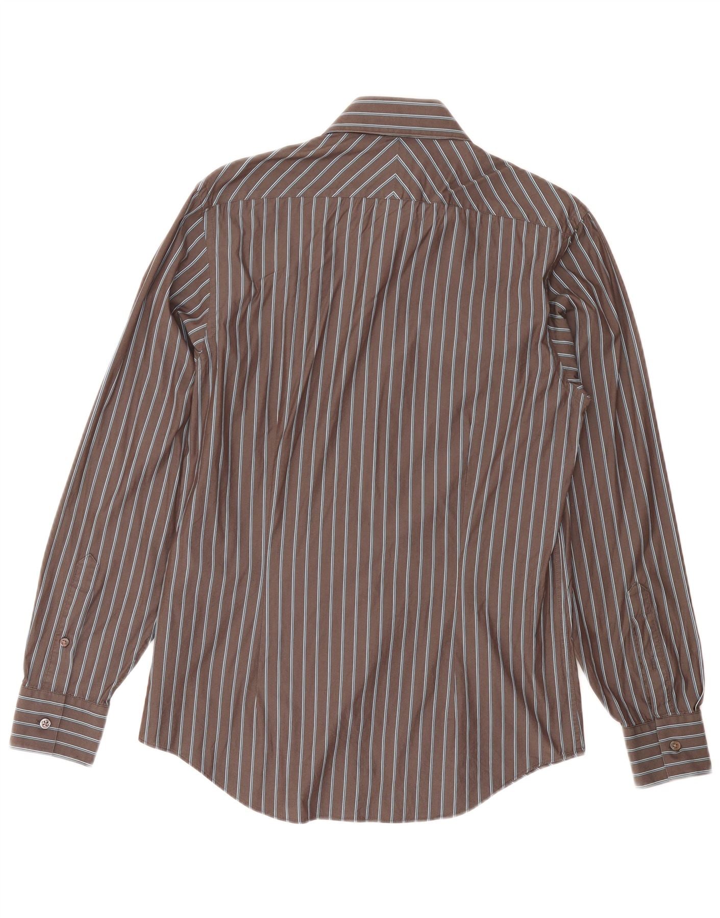 - KI-Beschreibung: Dieses formelle Herrenhemd von Calvin Klein ist aus einem braunen Mischgewebe mit glatter Oberfläche gefertigt. Die Mischung aus Baumwolle, Nylon und Lycra-Spandex bietet Komfort und Dehnbarkeit. Es verfügt über ein ausgeprägtes Streifenmuster in kontrastierendem Blau und Weiß. Ton-in-Ton-Knöpfe sichern den Verschluss vorne. Ein klassischer Kragenausschnitt und lange Ärmel prägen seine Struktur. Die schmale Passform sorgt für eine moderne, maßgeschneiderte Silhouette, perfekt für elegante Anlässe.