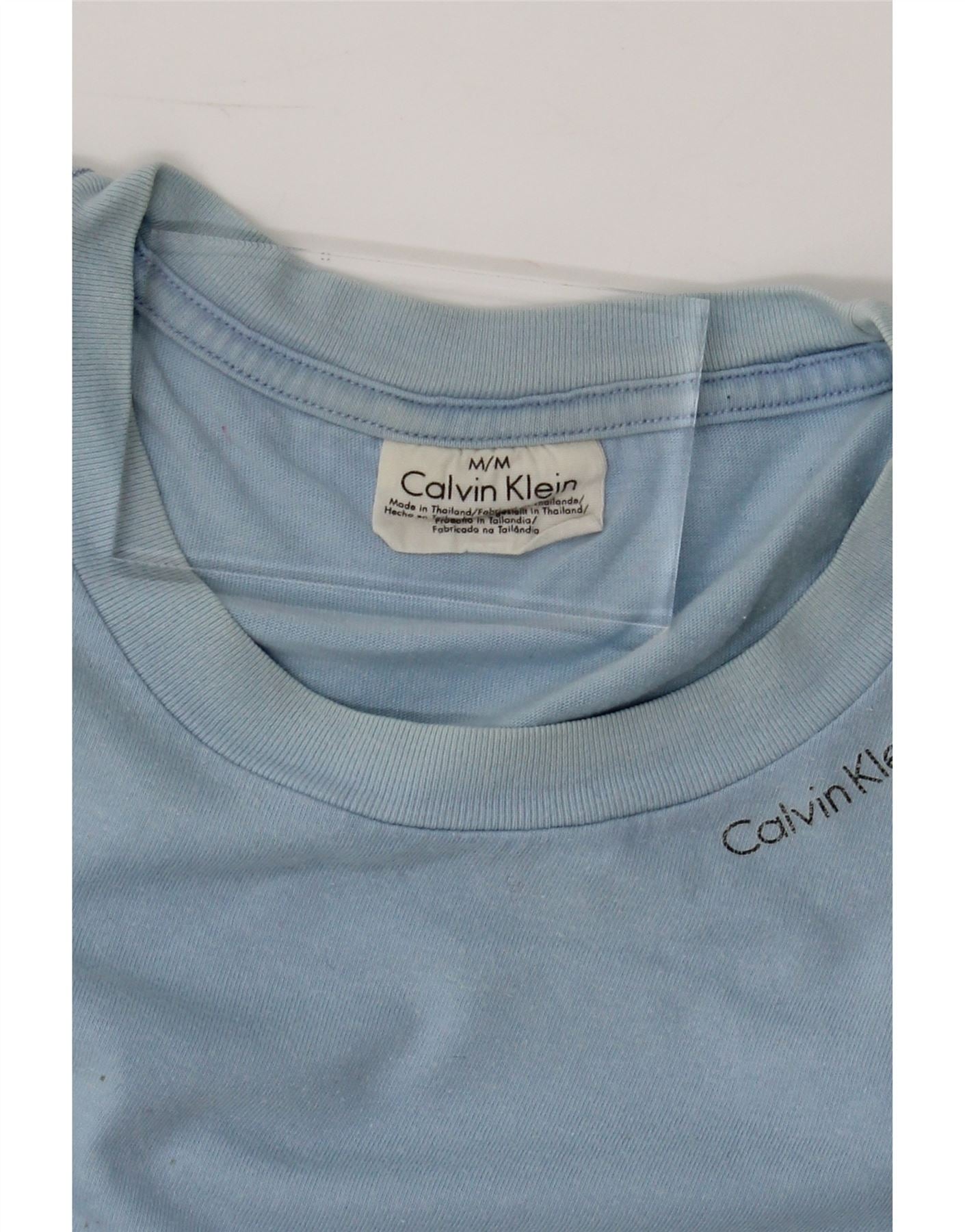 - AI Description: This pre-owned Calvin Klein T-shirt is a classic wardrobe staple for men. Crafted from comfortable jersey fabric in a versatile blue hue, it features a regular fit, round neck, and short sleeves. The pullover closure ensures easy wear. A subtle logo adds a touch of branding. While in excellent condition, it has minor stains on the front and visible wear overall. Label size M/M. Perfect for everyday wear.