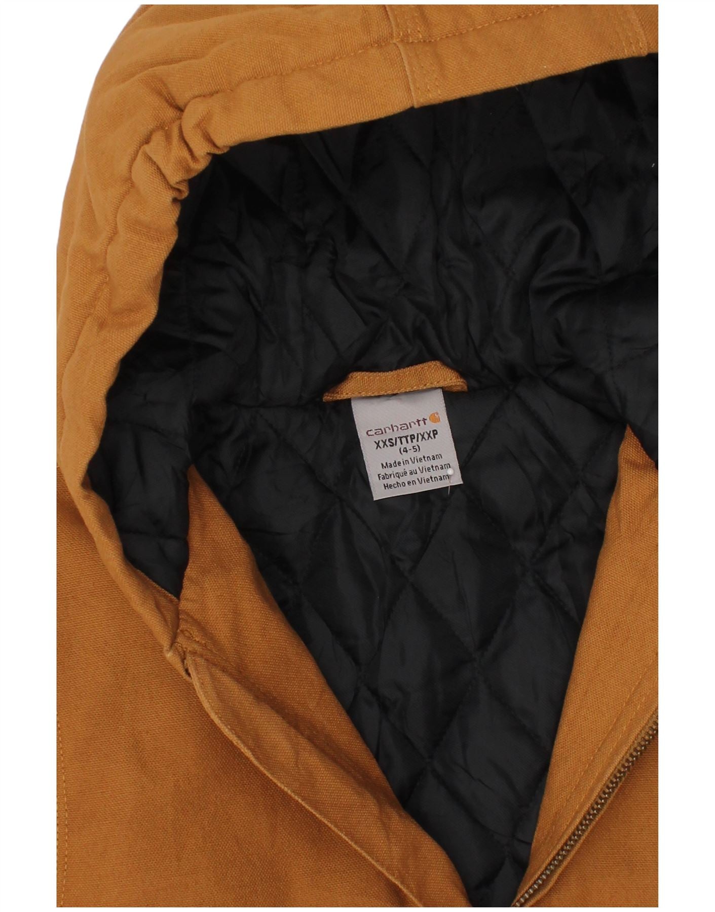 - AI Description: This Carhartt boys' bomber jacket is crafted from durable brown canvas, offering a robust feel. It features a quilted lining for added warmth and comfort. The classic regular fit ensures ease of movement. It includes a practical hood and long sleeves. A full zip closure secures the front. Multiple pockets provide utility. A subtle Carhartt logo adds a signature accent.