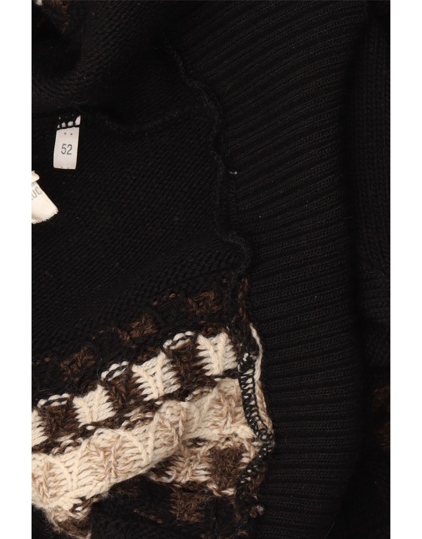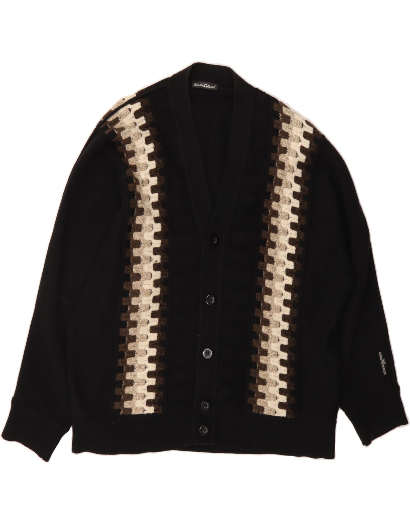 - AI Description: This pre-owned Carlo Colucci cardigan sweater is a classic piece for any gentleman's wardrobe. Crafted in a black knit fabric with a geometric pattern, it features a V-neck, long sleeves, and a regular fit. The cardigan has a button closure and button accents, with practical pockets. Size 52. While in excellent condition, there is minor visible wear overall. A stylish and versatile addition with logo detailing. Recommended retail price: £95.