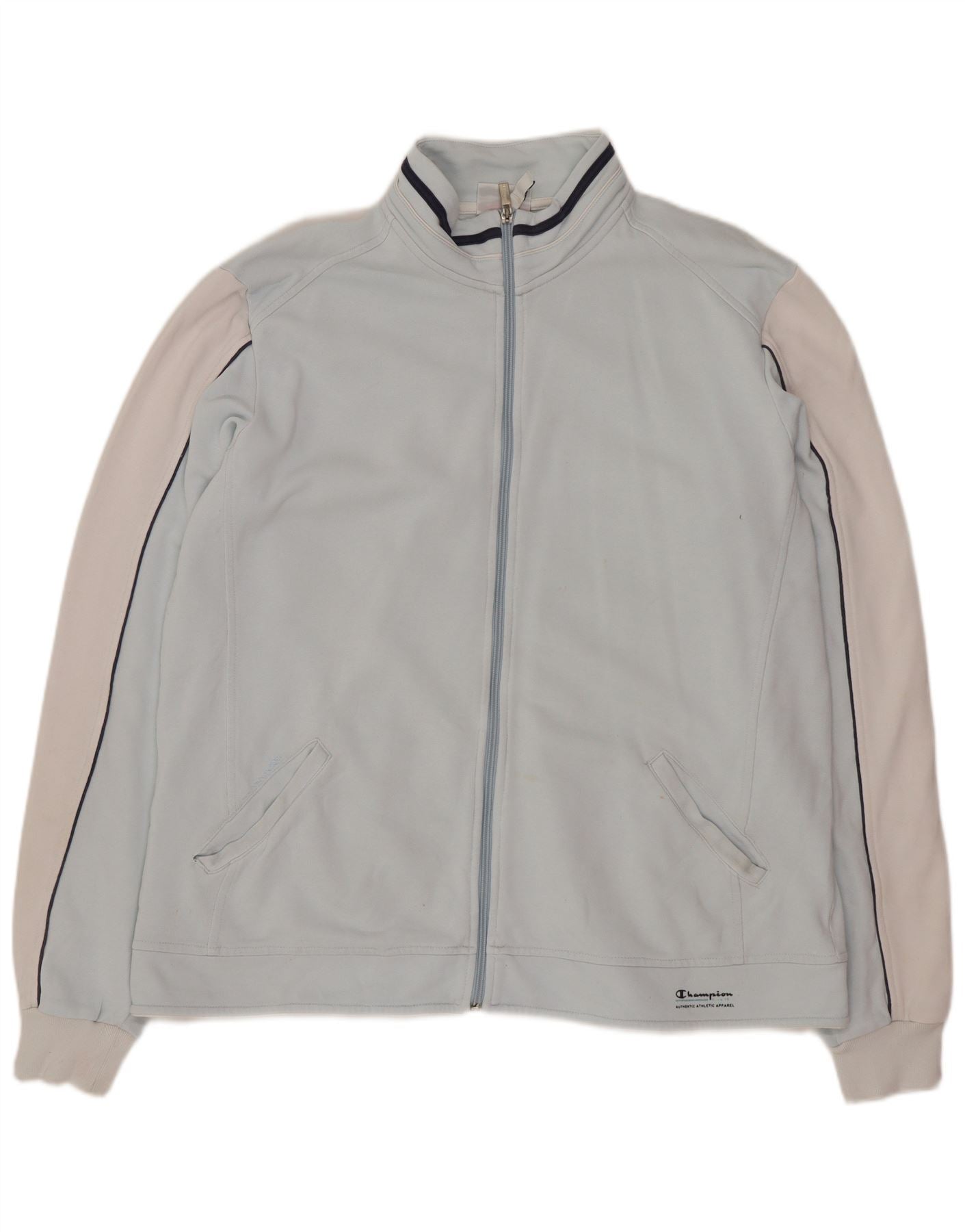 - KI-Beschreibung: Diese Champion-Trainingsjacke für Damen ist aus einem glatten Mischgewebe gefertigt. Es verfügt über einen hohen Kragen und einen durchgehenden Reißverschluss für vielseitigen Tragekomfort. Das Farbblockdesign kombiniert einen blauen Hauptteil mit cremefarbenen langen Ärmeln. Entlang der Ärmel verlaufen dunkle Paspeldetails. Bündchen an den Handgelenken und eine normale Passform sorgen für Komfort. Ein dezentes Markenlogo rundet den sportlichen Stil ab.