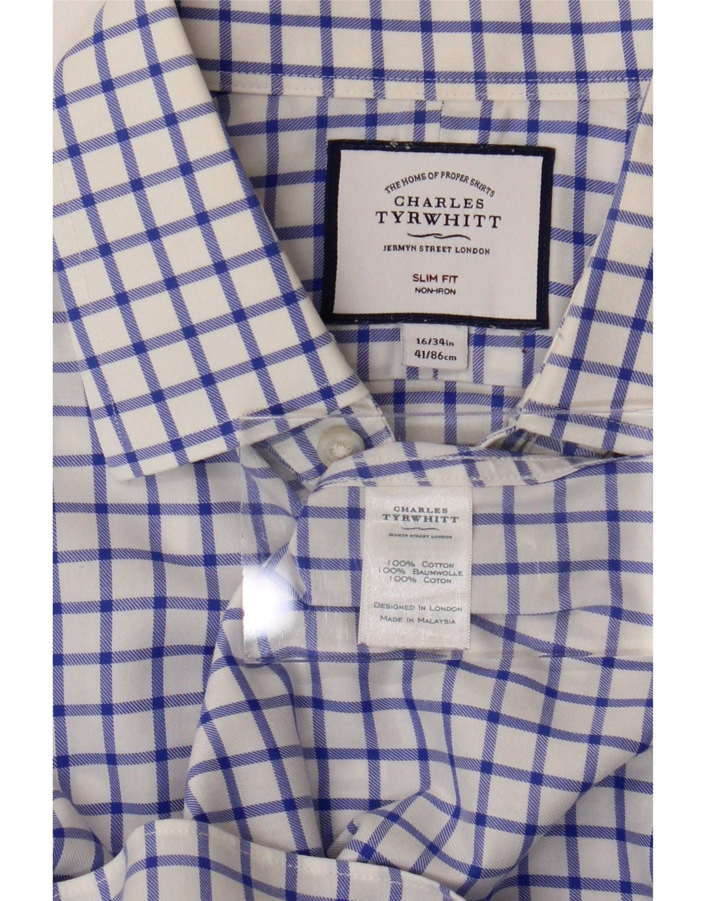 - AI Description: This is a pre-owned Charles Tyrwhitt men's shirt in excellent condition. Crafted from 100% cotton with a woven fabric, this slim-fit shirt features a classic collared neckline and long sleeves. The blue check pattern and button closure add a preppy style. Minor defects include loose stitching on the collar and sleeve, and minor stains on the collar. The label size is 16/34in. Made in Malaysia.