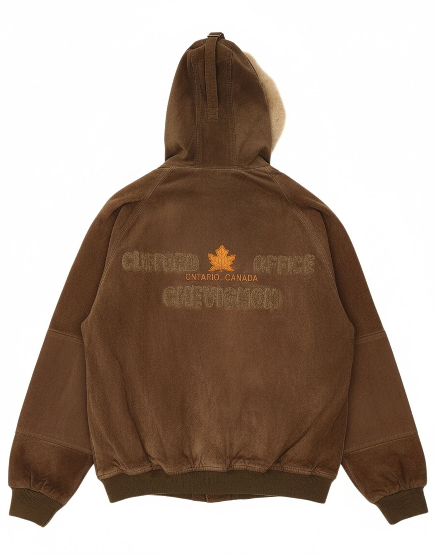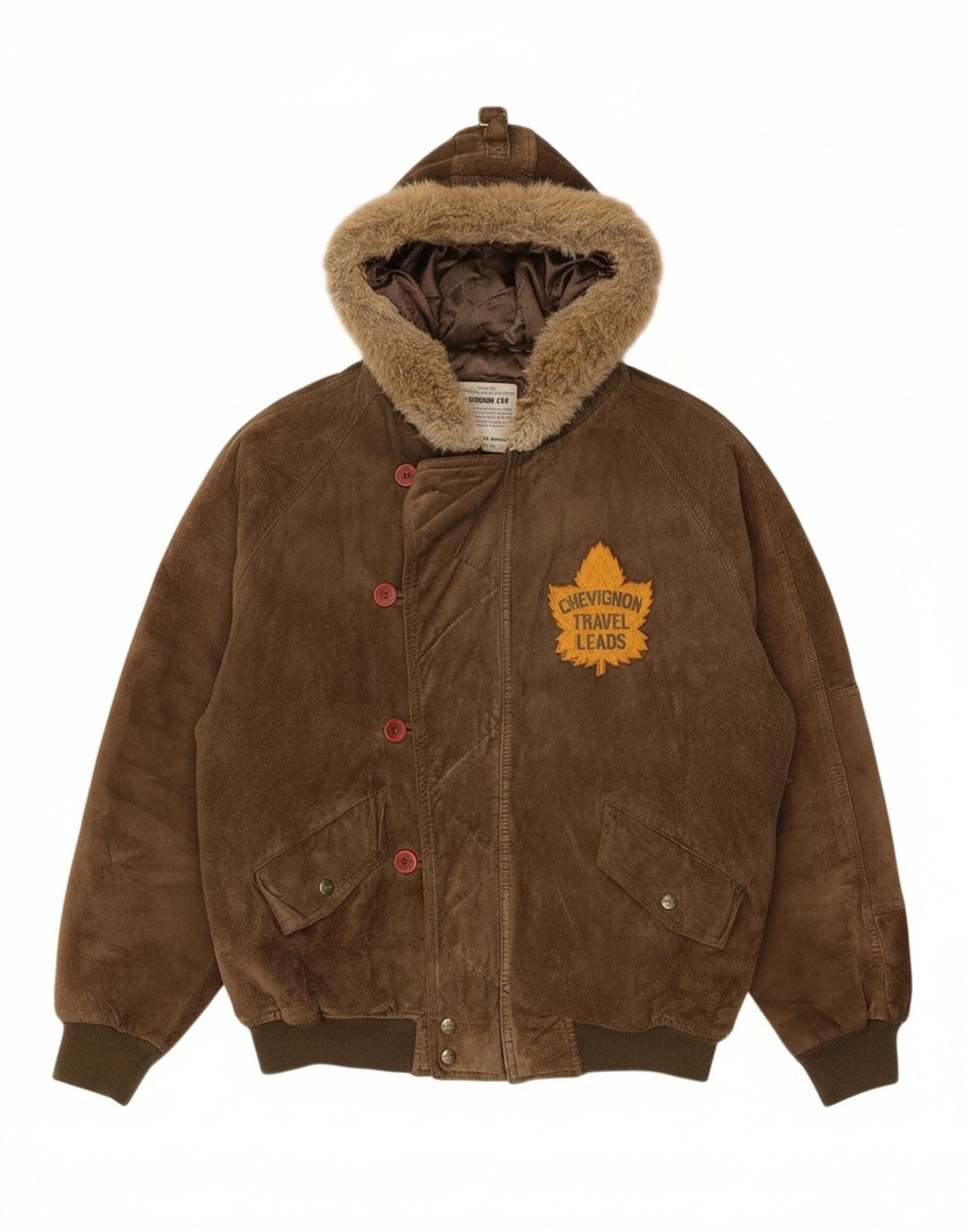 - AI Description: This Chevignon mens brown suede bomber jacket offers a luxurious feel. Its soft texture provides refined tactile appeal. The classic collared neckline and full button-up front define its structure. Long sleeves feature neat cuffs for a tailored finish. It includes a practical hood with a stylish fur trim. A regular fit ensures comfortable wear.