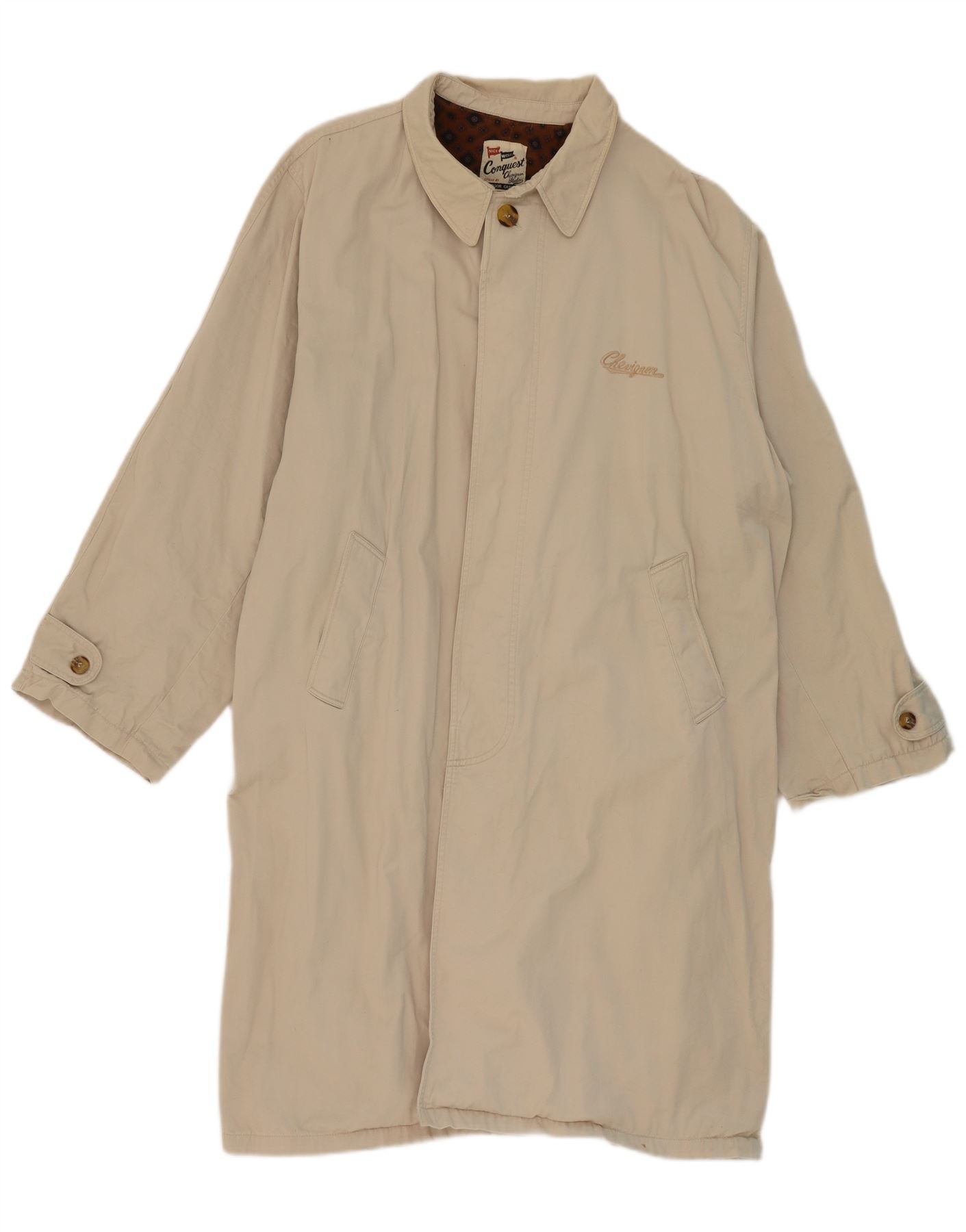 - AI Description: This Conquest mens trench coat is crafted from durable 100 percent woven cotton, presented in a classic beige hue. It features a sophisticated collared neckline and a traditional four-button front closure. Long sleeves provide ample coverage. The regular fit and lined interior ensure comfort and a smart silhouette. Practical pockets add functional detail to this timeless outerwear piece.