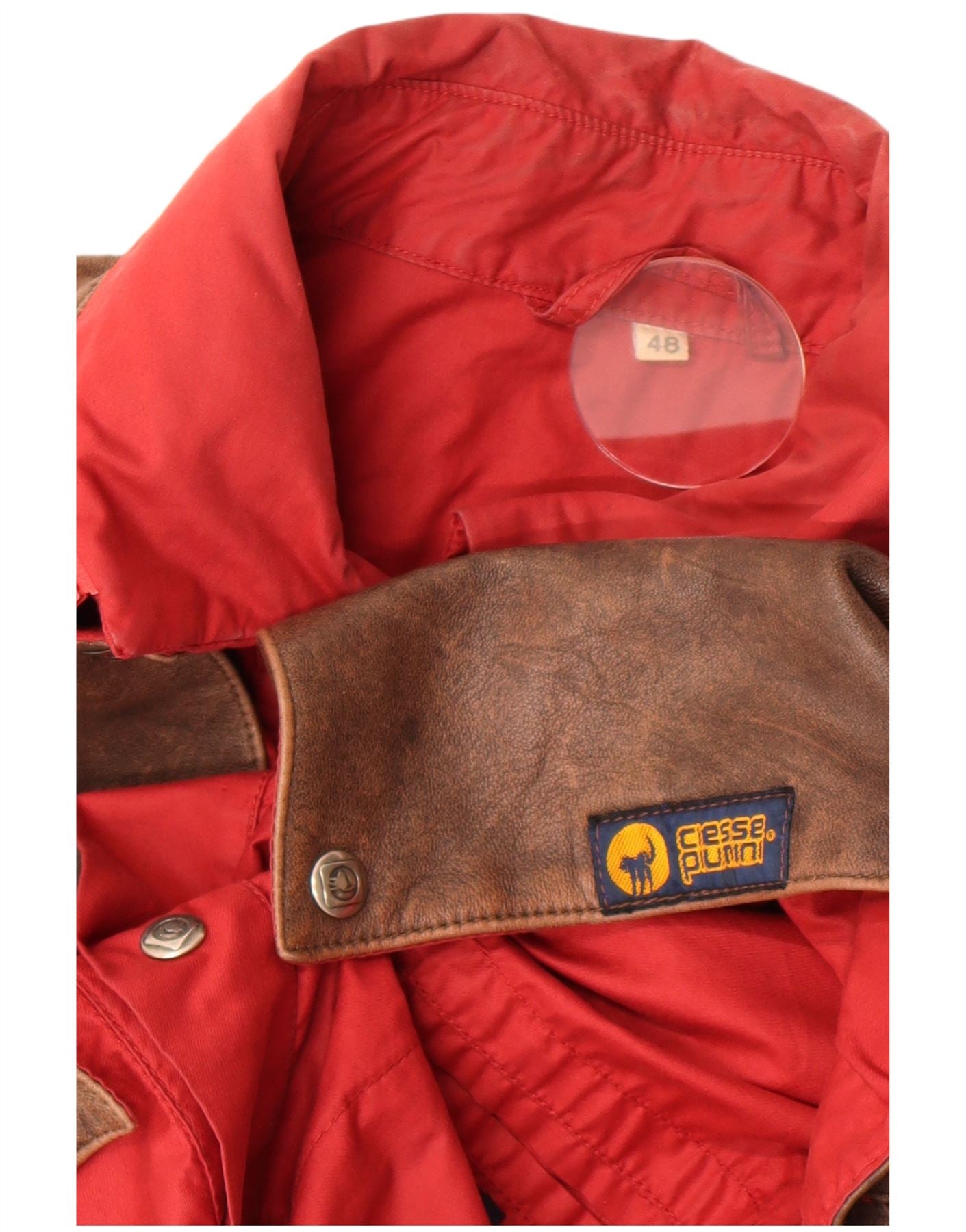 - KI-Beschreibung: Diese Herren-Utility-Jacke von Ciesse Piumini kombiniert einen leuchtend roten Mischstoff mit einer satten braunen Lederpasse. Der Kragenausschnitt und der durchgehende Reißverschluss bieten klassischen Utility-Stil. Die langen Ärmel verfügen über hübsche Bündchen, die die normale Passform ergänzen. Dezente Taschen sorgen für praktische Details. Ein markanter Ledereinsatz über den Schultern sorgt für eine robuste Struktur. Das Markenlogo rundet dieses Retro-inspirierte Design ab.