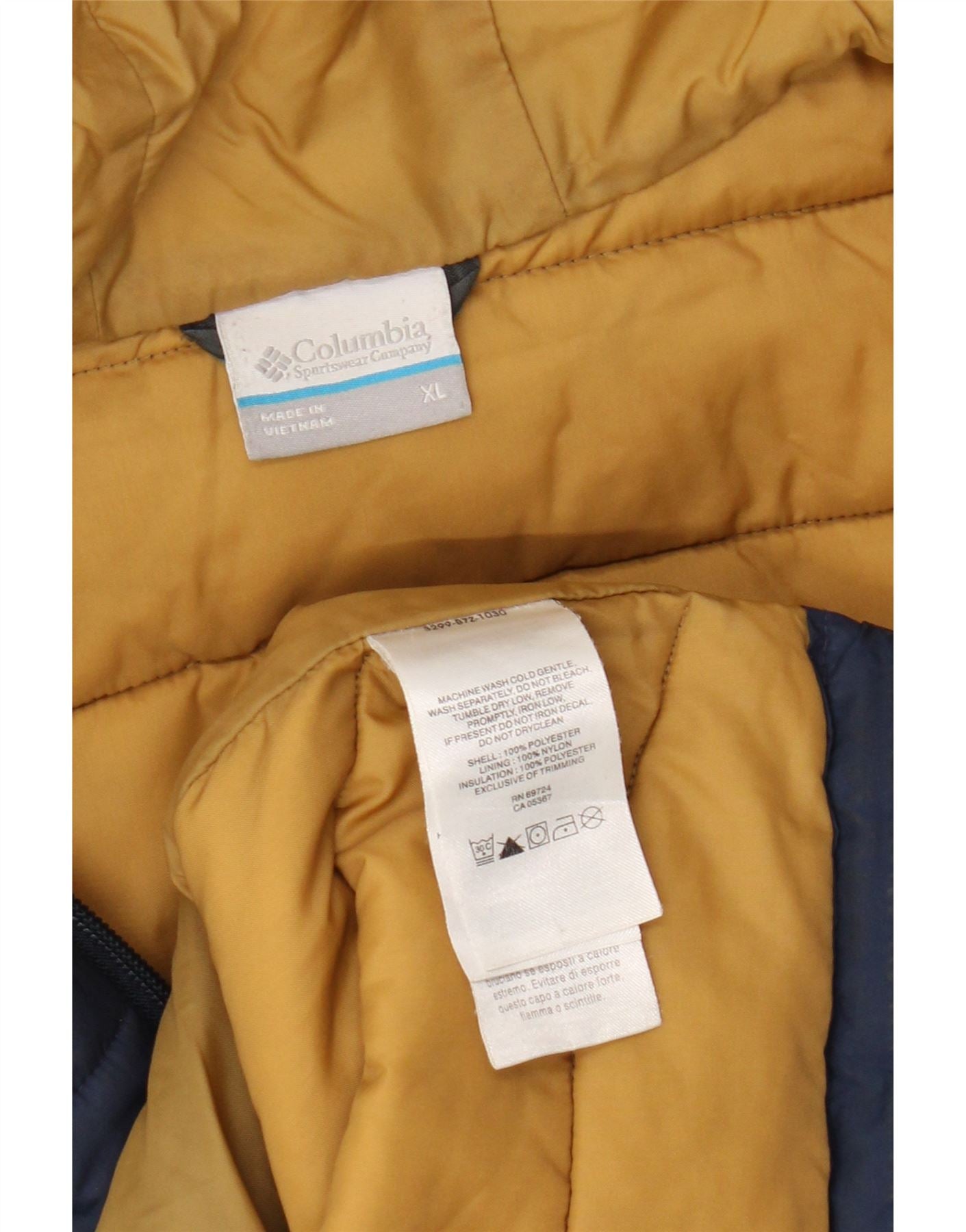 - AI Description: Stay warm in this pre-owned Columbia padded jacket. Crafted from 100% polyester with a nylon lining and polyester insulation, this classic style features a regular fit, long sleeves, and a zip closure. The hooded design includes practical pockets and full zip. Machine washable for easy care.