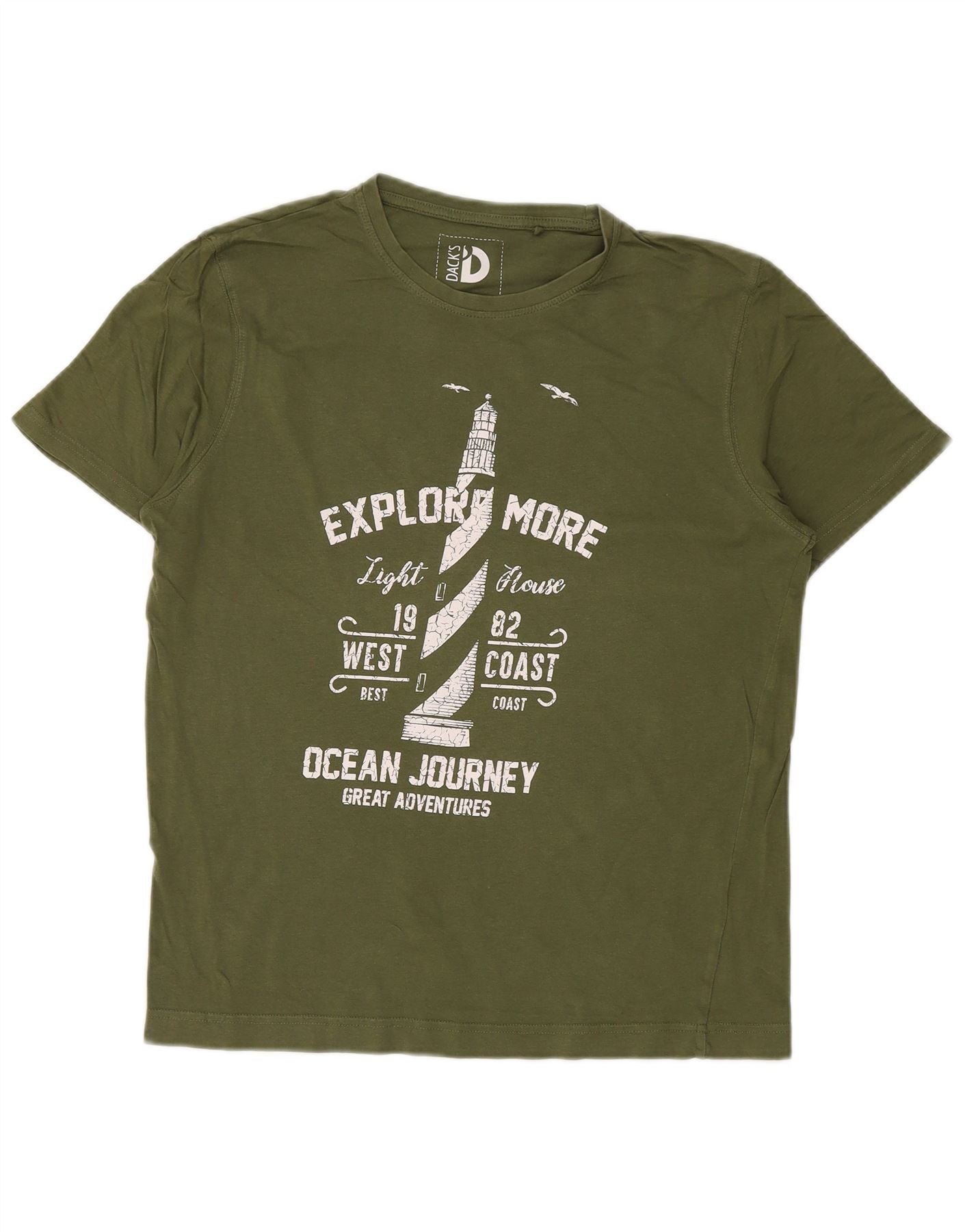 - KI-Beschreibung: Dieses grafische Herren-T-Shirt von Dack's ist aus weichem grünem Jersey aus 100 % Baumwolle gefertigt. Es verfügt über einen klassischen Rundhalsausschnitt und kurze Ärmel für alltäglichen Komfort. Die reguläre Passform sorgt für eine entspannte Silhouette. Eine auffällige nautische Illustration mit dem Text „EXPLORE MORE“ ziert die Vorderseite und verleiht ihm eine unverwechselbare Note. Dieses Pullover-Top bietet lässigen Stil und Tragekomfort.