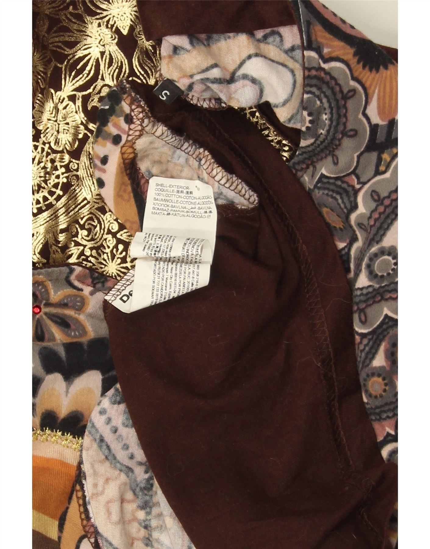 - KI-Beschreibung: Dieses grafische T-Shirt-Oberteil für Damen von Desigual ist aus einer weichen Jersey-Mischung aus Baumwolle, Viskose, Polyester und Elastan gefertigt. Es verfügt über eine kräftige braune Basis mit einem lebendigen Paisley- und abstrakten Muster. Der V-Ausschnitt und die langen Ärmel sorgen für eine klassische Silhouette. Die reguläre Passform wird durch einen asymmetrischen Saum ergänzt. Dezente Glitzerakzente unterstreichen das Bohemian-Design. Dieses Top vereint Komfort mit unverwechselbarem Stil.