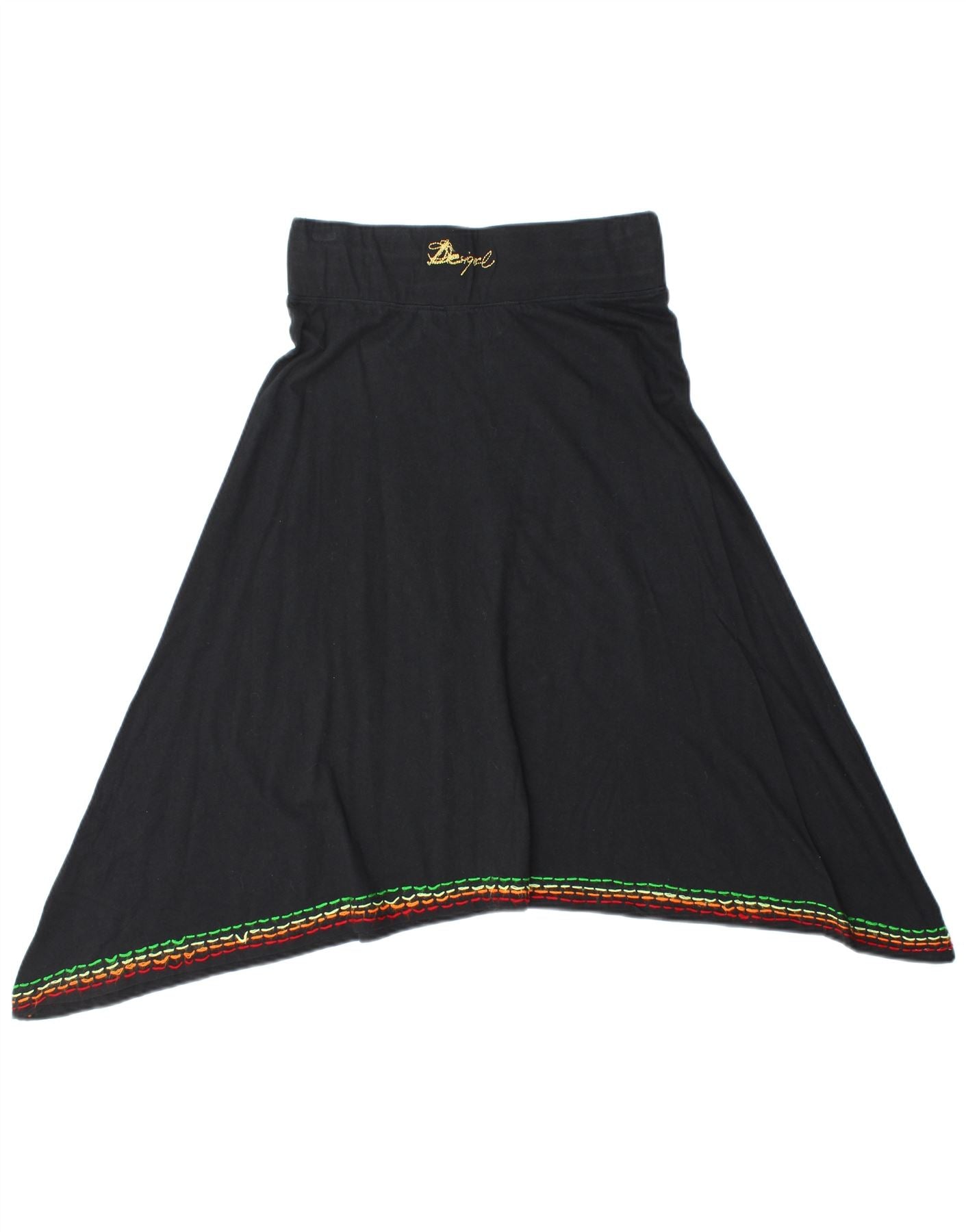 - KI-Beschreibung: Dieser asymmetrische Damenrock von Desigual ist aus weichem schwarzem Baumwolljersey gefertigt. Es verfügt über einen bequemen elastischen Schlupfbund. Der Midi-Rock hat eine entspannte, fließende Passform. Sein einzigartiger asymmetrischer Saum sorgt für eine unverwechselbare Silhouette. Kräftige Blumengrafiken zieren die Vorderseite mit lebendigen gestickten Akzenten. Der Saum ist mit farbenfrohen Nähten versehen, die den Bohemian-Charme unterstreichen.