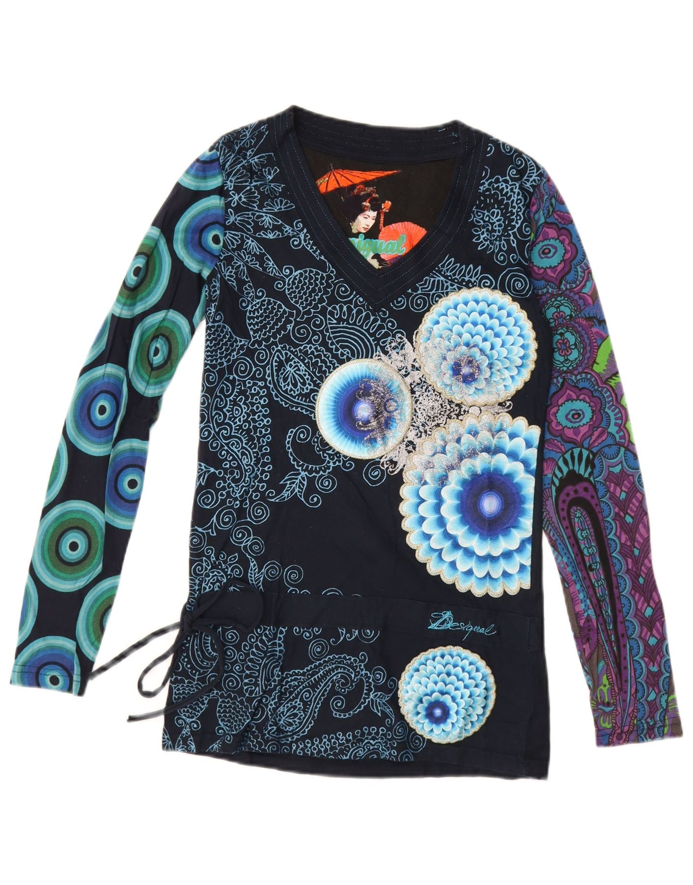 - KI-Beschreibung: Dieses grafische T-Shirt-Oberteil für Damen von Desigual ist aus weichem schwarzem Jerseystoff gefertigt. Es hat einen V-Ausschnitt und lange Ärmel. Die reguläre Passform bietet angenehmen Tragekomfort. Ein lebendiges Patchworkmuster ziert die Vorderseite und die Ärmel und zeigt aufwendige florale und geometrische Muster. Das Desigual-Logo ist dezent integriert. Verstellbare Seitenbänder sorgen für eine einzigartige Note und unterstreichen den Bohème-Stil. Dieses Pullover-Top ist perfekt für einen unverwechselbaren Casual-Look.