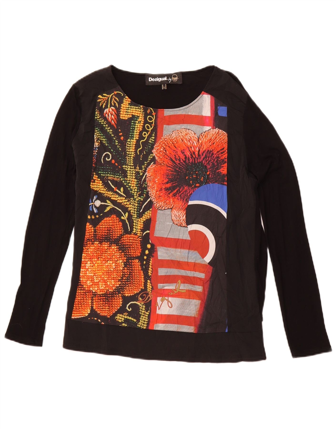 DESIGUAL Womens Graphic Top Langarm UK 14 Große schwarze Viskose mit Blumenmuster