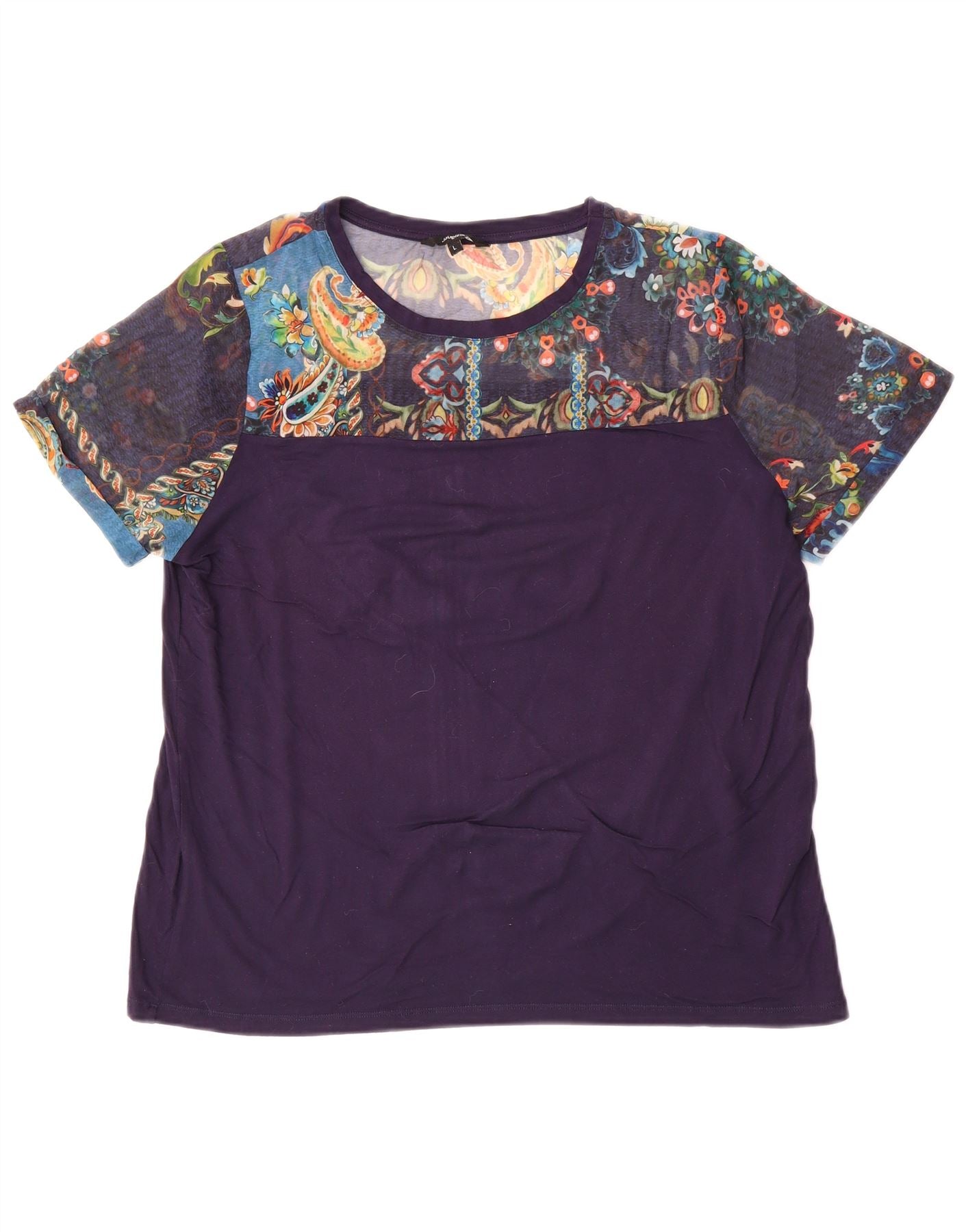 - KI-Beschreibung: Dieses grafische T-Shirt-Oberteil für Damen von Desigual ist aus weichem Jersey-Stoff gefertigt. Es verfügt über einen klassischen Rundhalsausschnitt und kurze Ärmel. Ein lebendiges, mehrfarbiges Paisley-Muster ziert den durchsichtigen oberen Teil und die Ärmel und sorgt für ein Bohème-Flair. Der Unterkörper ist in einem kräftigen Lila gehalten, was einen auffälligen Kontrast schafft. Die reguläre Passform sorgt für angenehmen Tragekomfort und macht es zu einer vielseitigen Ergänzung jeder Garderobe.