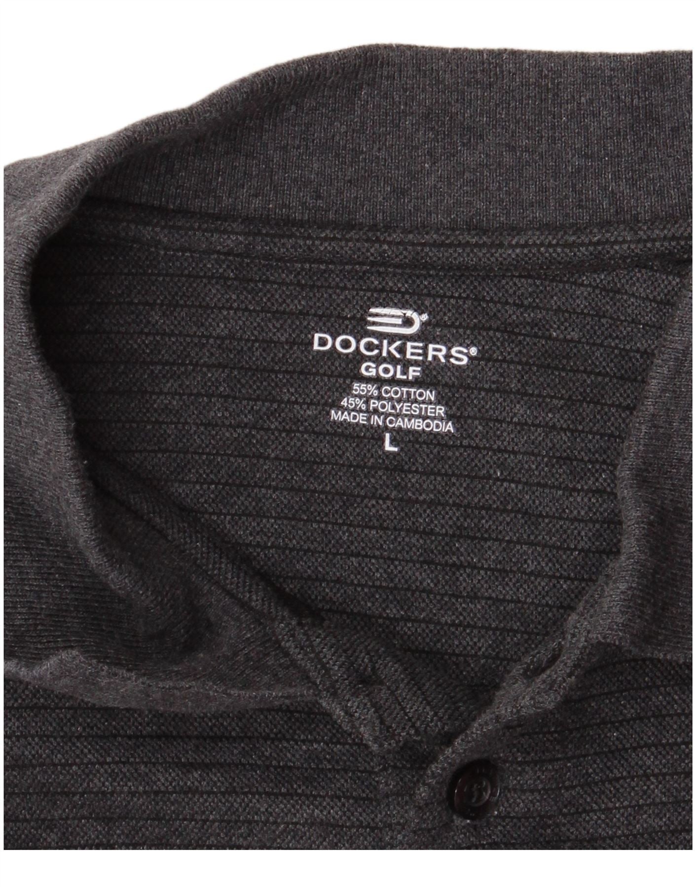 - AI Description: This Dockers mens Polo Shirt is crafted from a comfortable cotton polyester blend fabric. It features a classic collared neckline and short sleeves. The button-up placket adds traditional detail. A subtle striped pattern runs horizontally across the dark grey fabric. This regular fit polo is ideal for golf or casual wear, offering both style and comfort.