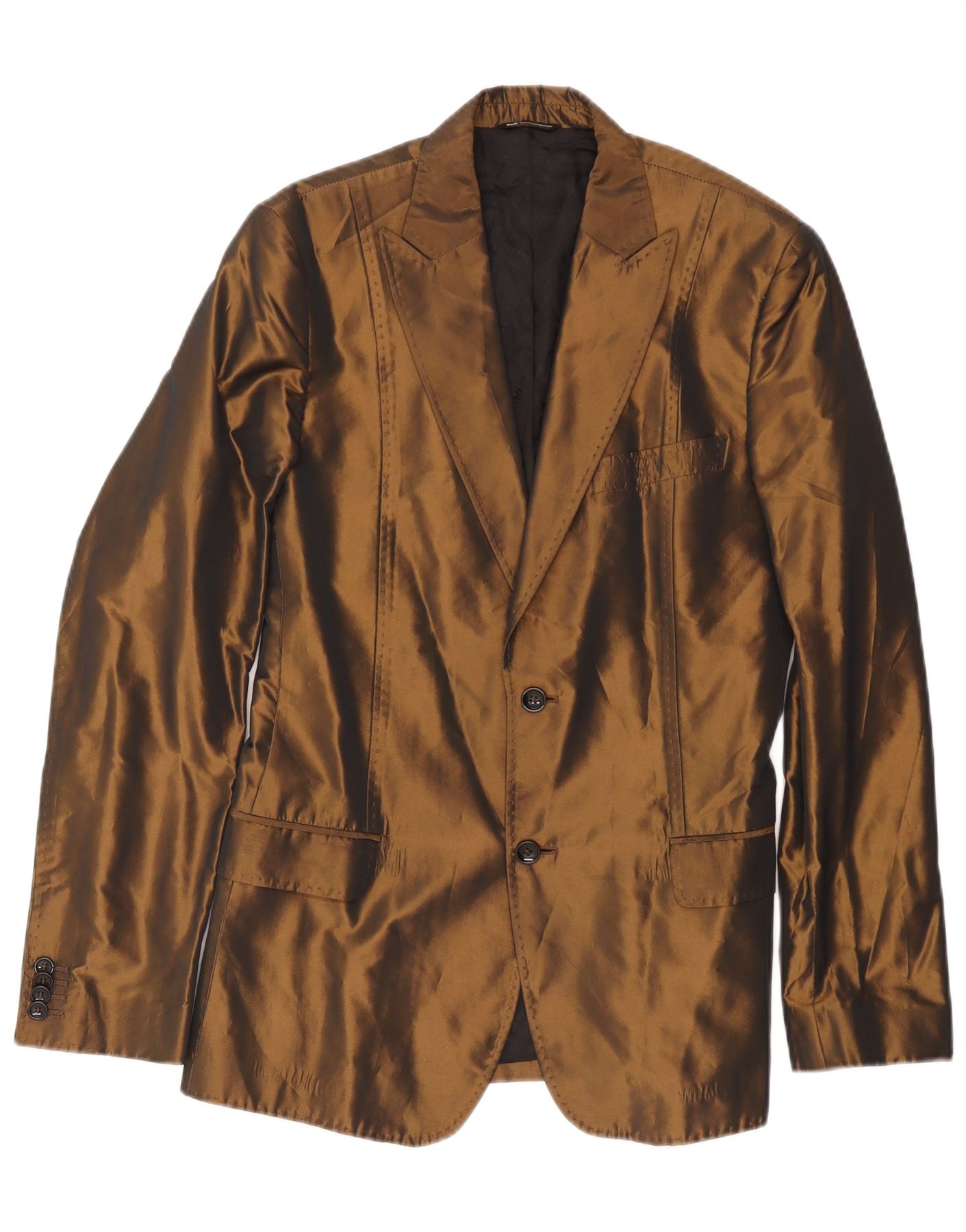 - KI-Beschreibung: Diese zweiteilige Herrenanzugjacke von Dolce Gabbana ist aus einer luxuriösen braunen Satinmischung gefertigt und bietet einen unverwechselbaren Glanz. Es hat einen Kragenausschnitt und lange Ärmel. Die reguläre Passform sorgt für eine bequeme Silhouette. Ein Zwei-Knopf-Verschluss vorne und Knopfakzente an den Manschetten sorgen für klassische Schneiderkunst. Es verfügt über praktische Taschen und ist für mehr Komfort vollständig gefüttert.