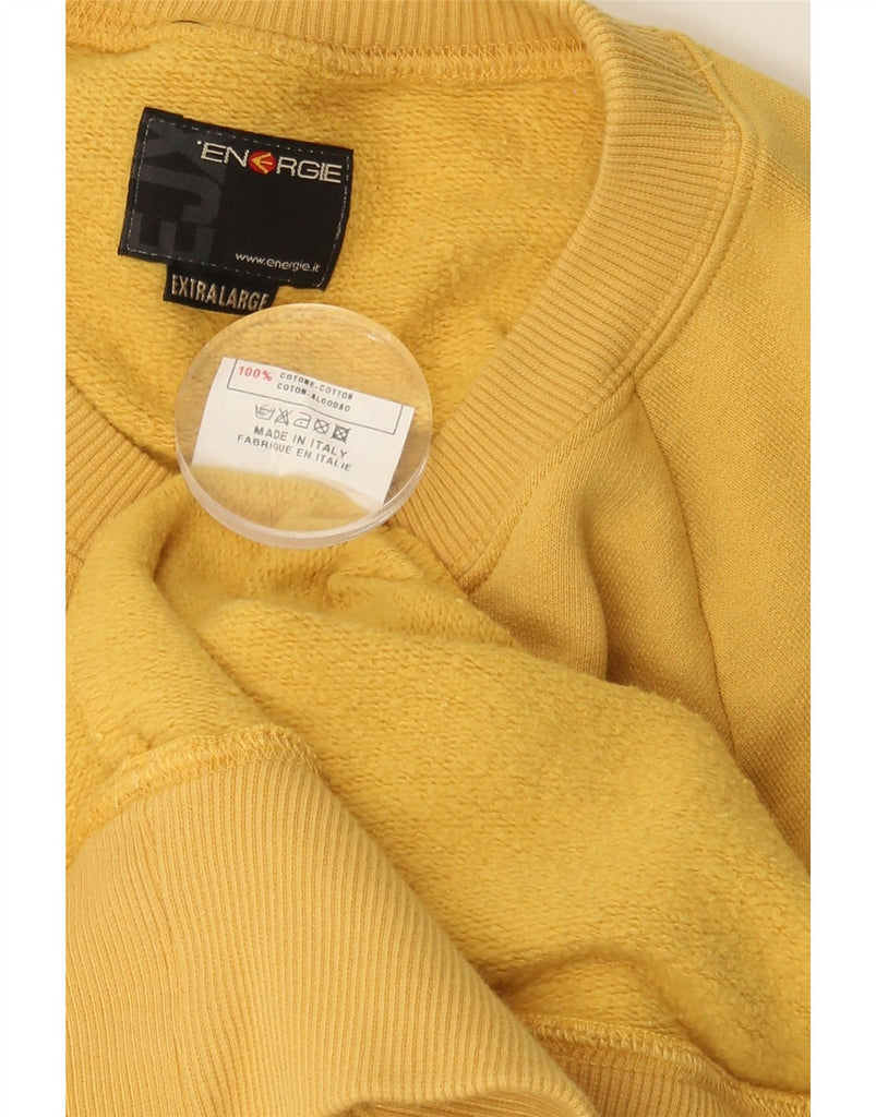 - AI Description: This Energie mens sweatshirt jumper is crafted from soft 100 percent cotton knit fabric. The vibrant yellow pullover features a classic round neck and long sleeves with cuffed ends. Its regular fit offers comfortable wear, perfect for a casual look. A prominent graphic detail adds a distinct style to this versatile piece.