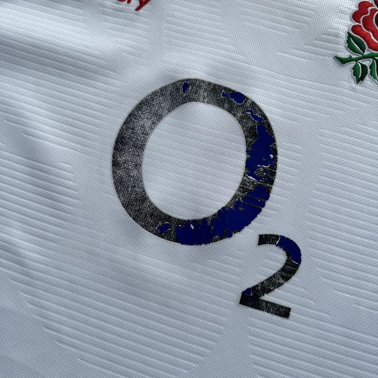 Klassisches Canterbury England Rugby-Oberteil in Weiß mit gestickten Logos und O2-Sponsor auf der Brust