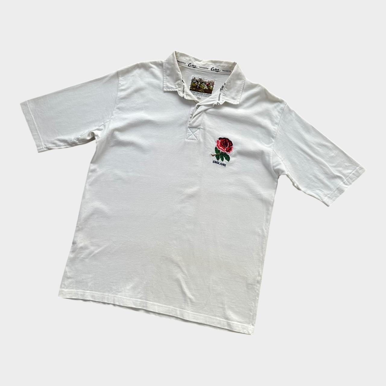 Vintage 90er-Jahre-Rugby-Oberteil von Cotton Traders England in Weiß mit gesticktem Logo auf der Brust